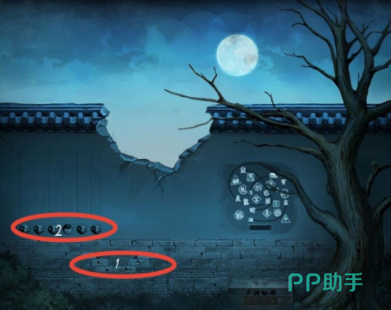 2、根据墙壁上的点转动阴阳卦的解密,将灯笼挂在侧边门上。