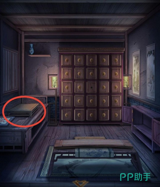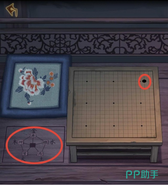 在这一关卡玩家需要分别进入到左右两个不同的房间里面,首先是在左边的厢房,各位玩家朋友需要首先点击床榻的左下角有文字的地方,发现一条“上为金木水火土,下是宫商角徵羽”的线索,其次去需要点击床榻上的棋盘,点击缺少的部分根据刚才发现的线索,打开机关获得“拉环”和“纸张”这两个道具。