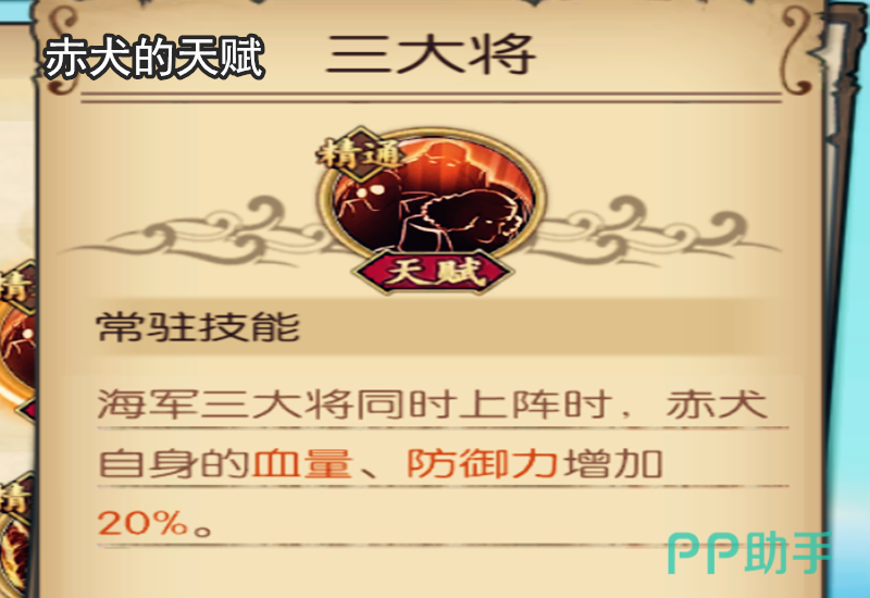赤犬的肉被限制住了,赤犬、黄猿、青雉同时上场彼此都会有一个属性提升,赤犬会有20%的血量与防御提升。而这个血量,是与赤犬的每回合护盾直接挂钩的。血量越高,赤犬的护盾越厚,坦度也就越高。