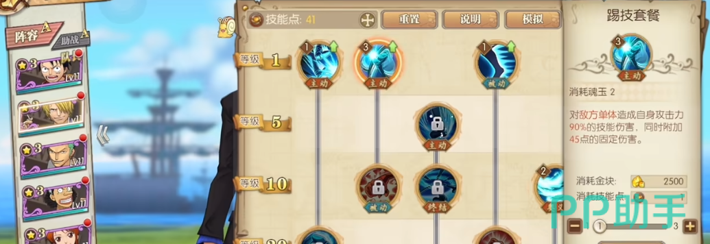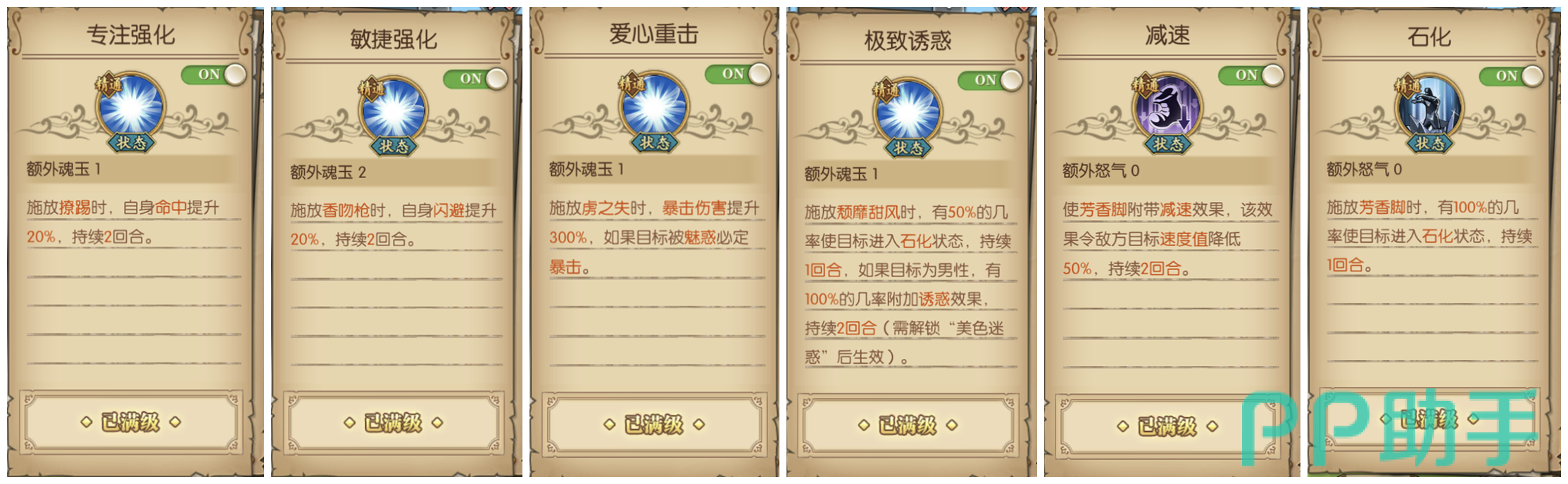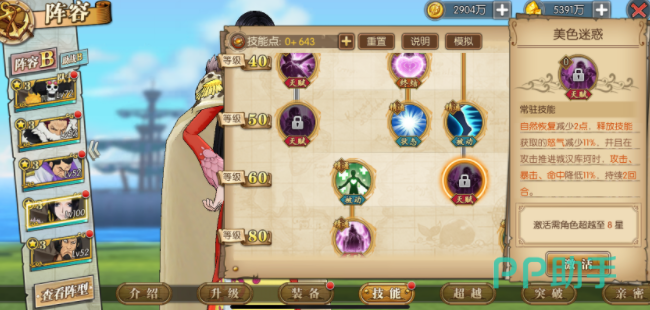 2. 人物技能主要分为主动技,终结技和奥义,天赋和被动。释放主动技和终结技会消耗魂玉获得怒气,100点怒气可以释放奥义,伤害类技能升级后,伤害比例会相应增加。在加点时重点考虑奥义、状态和天赋。这部分技能是常驻的,新手点数不是非常多,船长可合理分配,着重注意常驻!