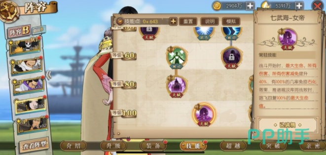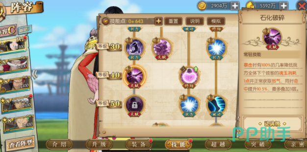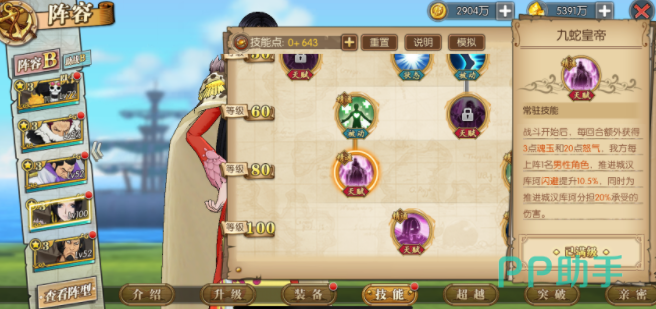 3. 角色培养的方式很多,从等级提升,黄金战魂升级、角色突破、装备、宝石、训练、附魂、称号附加。此外,使用船只在海战洗技能还可在PVP使用。