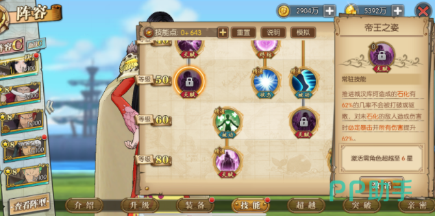 可以看到,这里全都是点满的。稍微说一下,白胡子速度很慢,到80级才有一个10.5%的速度加成。但因为白胡子的天赋自我保护本领很强,因而这个速度不算太关键。刷剧情一定要带上一骑当千,假如暴击,大概几十万伤害直接秒了一些BOSS。