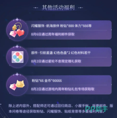 最后,最不能错过的就是六周年心意回馈。通过邮件领取的回馈礼物,内含【航海旅伴】闪耀单品、888粉钻、666体力以及66666金币,简直就是让你从头到脚焕然一新。8月6号到8月15号,别错过这段时间的回馈福利,赶紧领取吧!