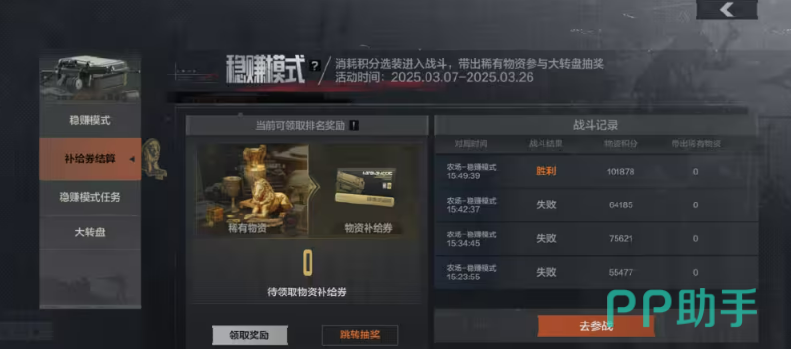 这次的电视台稳赚模式是一个限时活动,从3月21日开始,持续到3月26日结束。在这段时间内,玩家们只要登录游戏,就能获得免费的物资积分,而这些积分将是你进入这个模式的“入场券”。不仅如此,你还可以通过参与战术行动来积累更多的物资补给券,这可是轻松获取奖励的捷径。