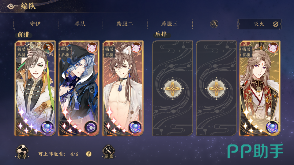 由于惊墨是属于脆皮性输出位,在阵容搭配方面就需要注重惊墨的保护,提供一个安全的输出环境,推荐可使用文老师、季元启、月灵和宣连隐,这个阵容能够自由切换前后排位置,叠加回怒能力和提高整体的生存能力,达到极高的战斗效果。