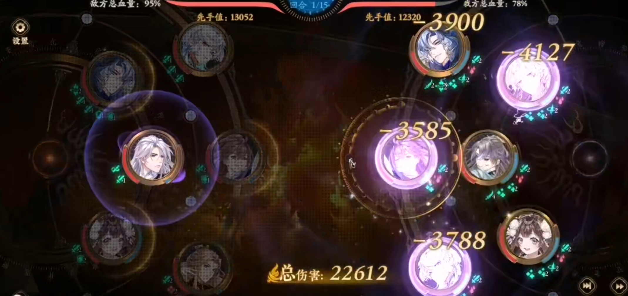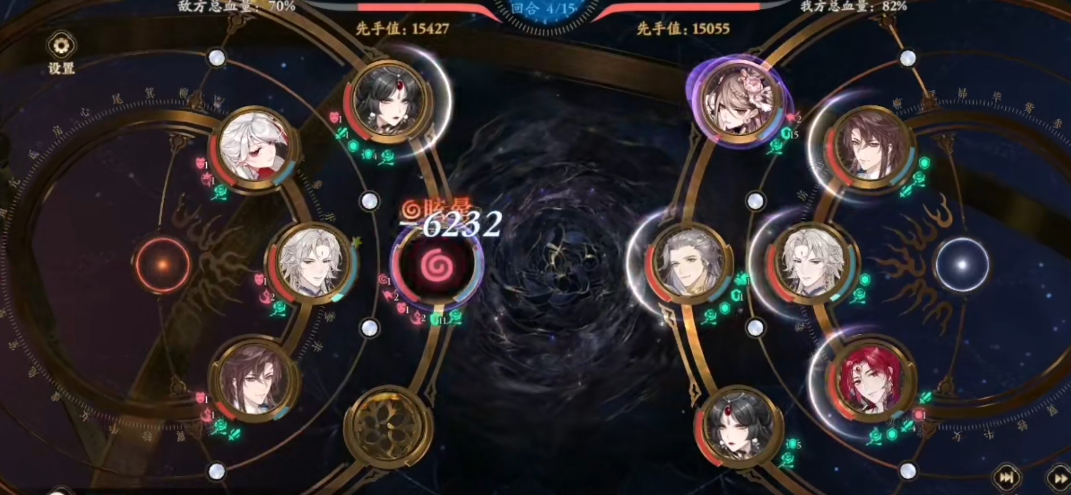 先手:先手是一个团队属性,在战斗开始前,将参战的所有名士先手值累加,并与敌方团队先手值进行对比,先手值更高的一方,则获得先手权,能够率先行动。
