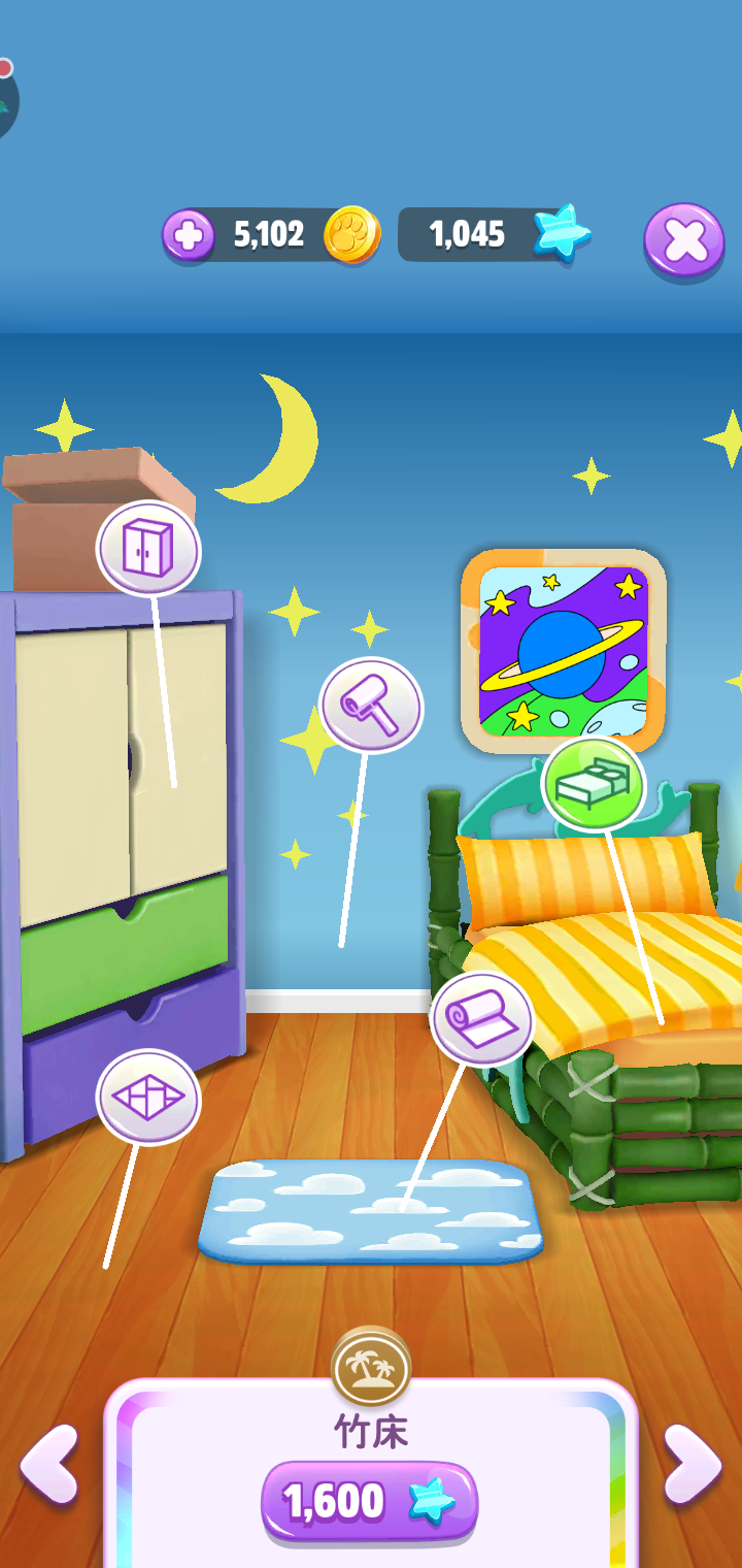我们能看到上面两种床都是需要购买的。舒适床要1600个金币,竹床要1600个星星值。如果金币或星星值不够的话,可以参考小编的金币和星星值获取方式。