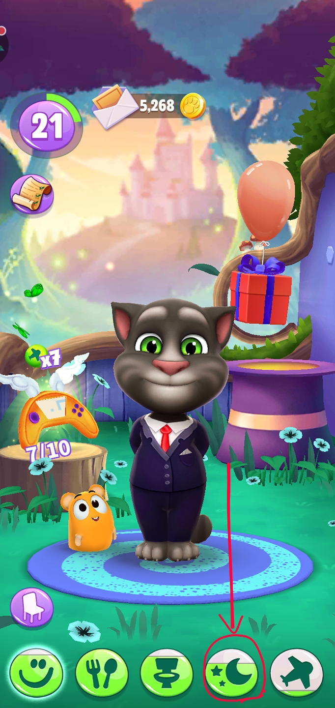 首先我们来到大厅,大厅是给汤姆猫玩乐从而使开心值和经验值增长的地方。我们可以点击汤姆猫身后的帽子和游戏机让汤姆猫来感到开心。