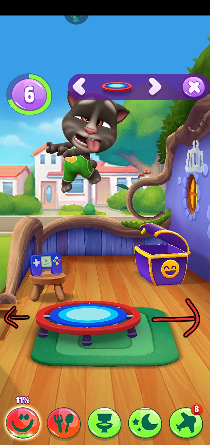 然后我们再切换一下玩具。这次切换到的玩具是跳跳床,汤姆猫会再跳跳床上蹦来蹦去的,汤姆猫的降落点是不同的,我们要靠移动跳跳床来确保汤姆猫不会摔。如果汤姆猫降落在跳跳床的中心位置就会越蹦越高。