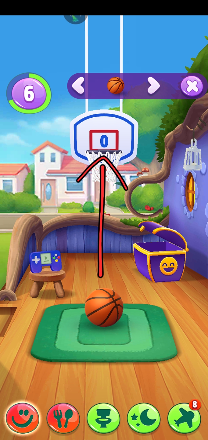 点击了右边的箭头以后我们就切换到别的玩具的场景。我们现在切换到的玩具是篮球投框。顾名思义就是要找合适的角度把篮球投进篮球框里,篮板上会有计数。篮球框不会一直在同一个地方,投一个球篮球框就变一个地方。