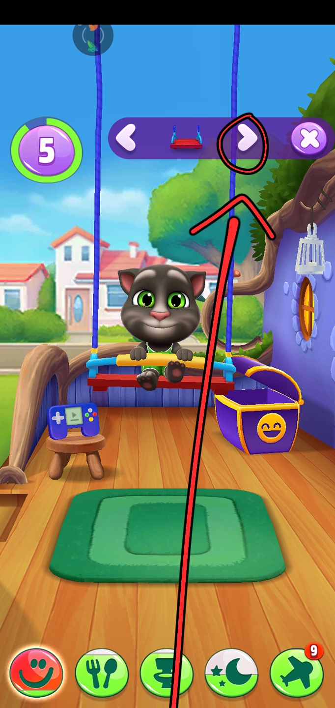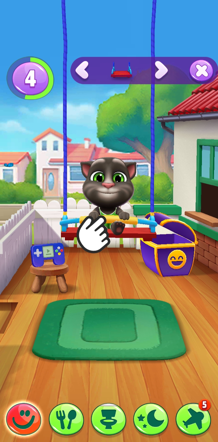 箱子里面是汤姆猫的玩具。我们点开箱子以后就能看到汤姆猫坐在秋千上。秋千是汤姆猫的玩具之一,我们可以把秋千往下拉,当我们放开秋千的时候,汤姆猫就会往上弹。我们还可以用手指在屏幕上上下滑动,汤姆猫就可以坐着秋千前后晃动。