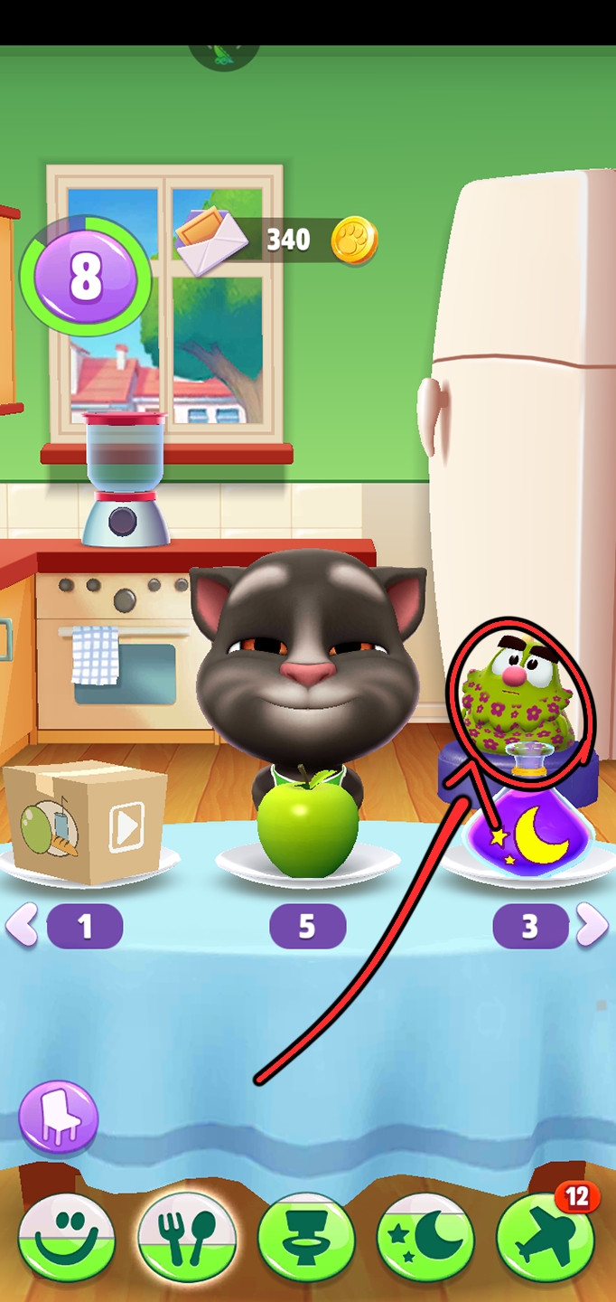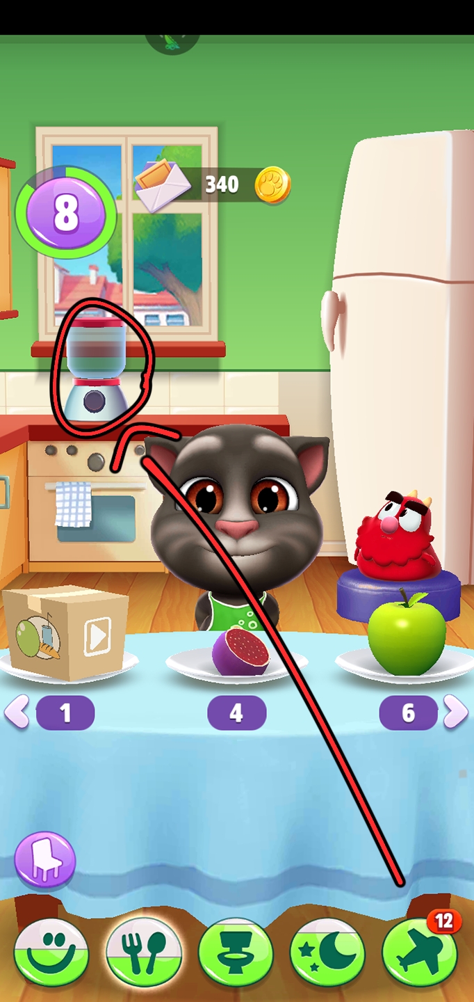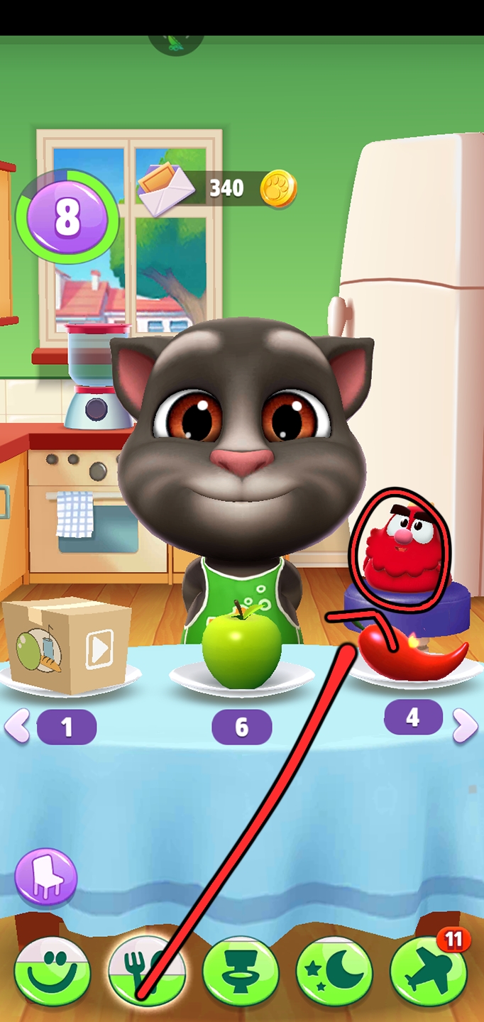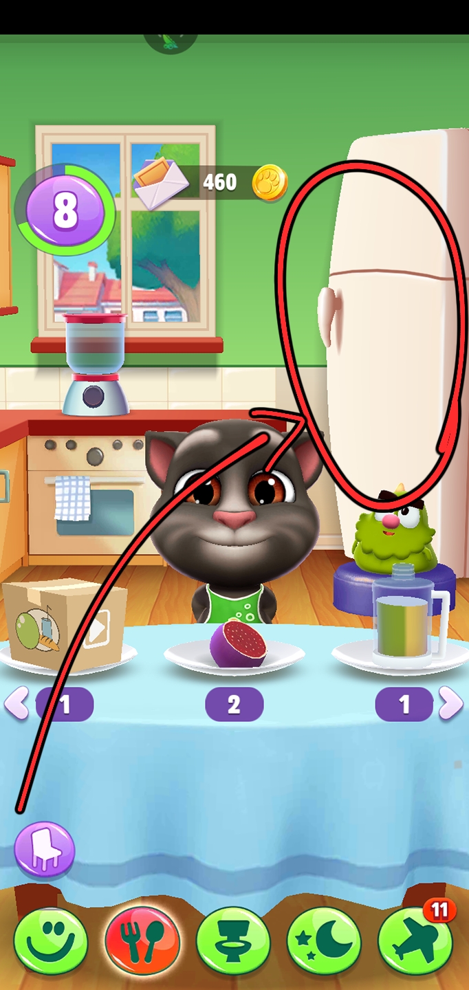 买好食物以后我们再来到厨房。来到厨房以后我们把食物滑动到汤姆猫身旁的宠物淘气鬼的嘴边,喂给淘气鬼吃。