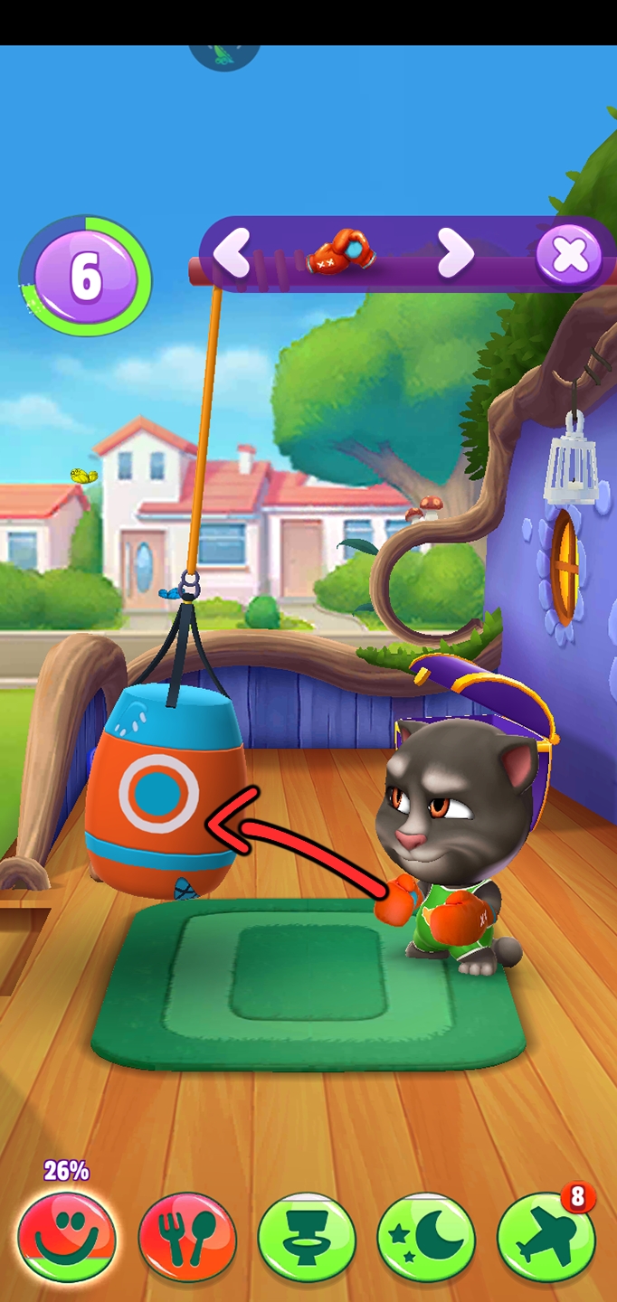 我们再来切换下个玩具。这个玩具是沙包,汤姆猫站在沙包旁边,我们点击一下沙包,汤姆猫就会打一下沙包。有时候击打不当就会变成沙包打汤姆猫。