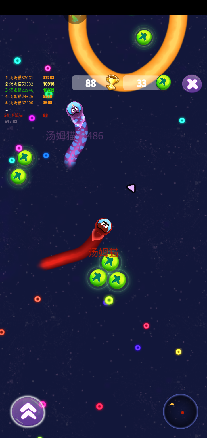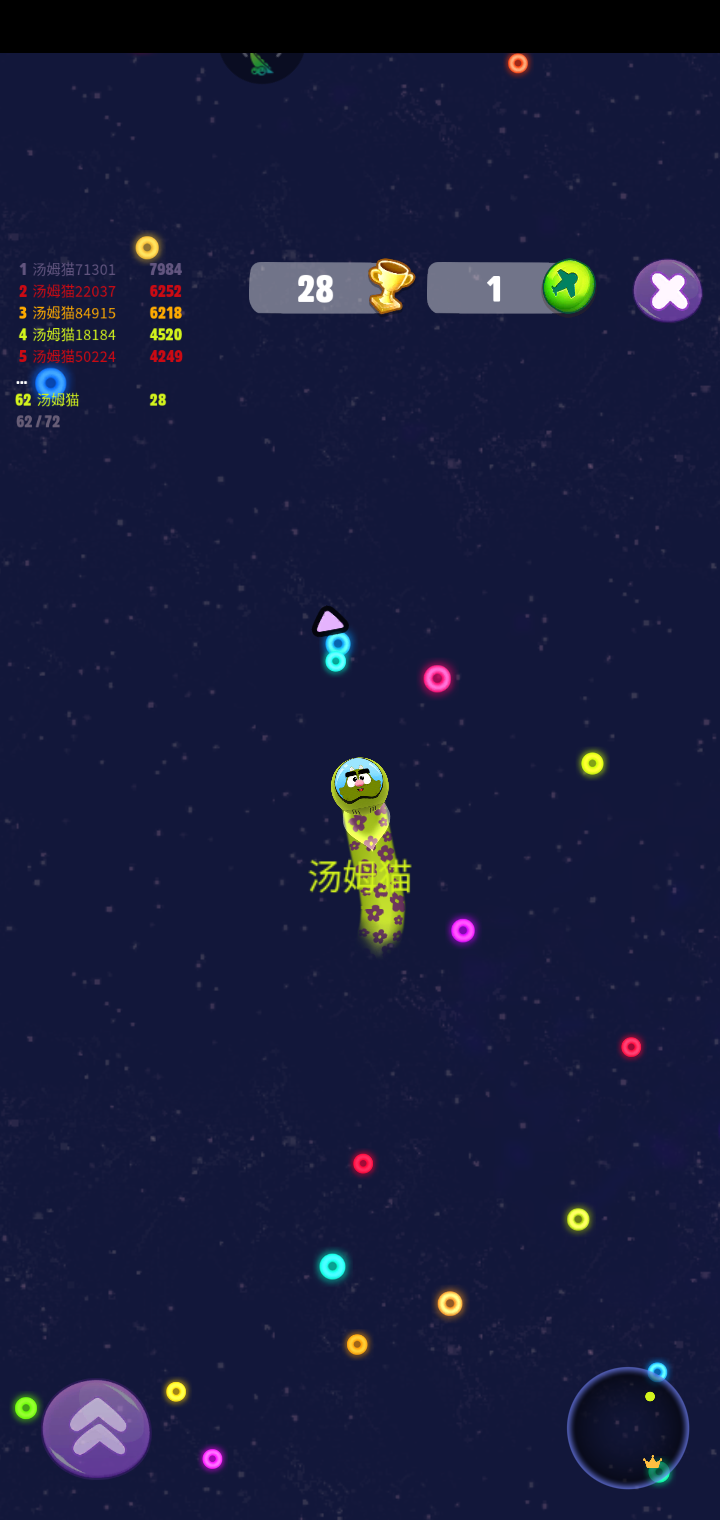 第三份游戏是太空轨迹。这个游戏是汤姆猫的宠物淘气鬼坐在火箭里面,由我们来引导淘气鬼去吃那些五颜六色的圈圈和飞行币。在吃的同时也要注意避开其他玩家,如果撞到其他玩家,那就会游戏结束。