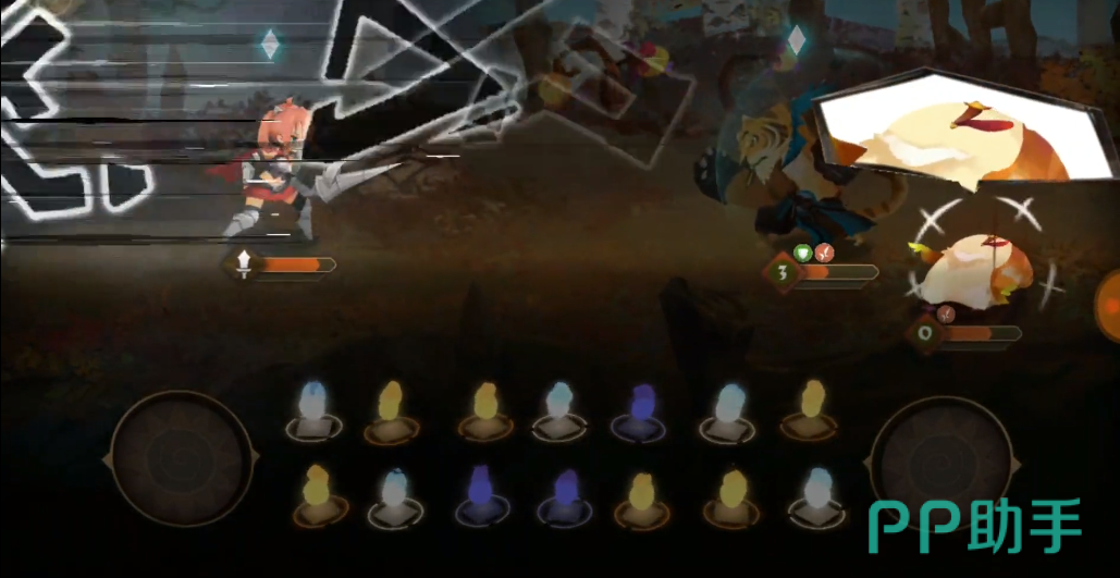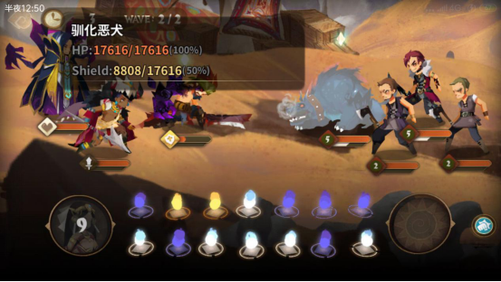 而第二波的敌人则是稍有些难度,敌方的前排是一只血量极高的驯化恶犬,攻击cd为5回合,我们可以利用敌方时间较长的攻击cd来找机会攻击。可以让我们的白位辅助来为蓝位或是金位打上增强效果,直接一波集火将其带走。