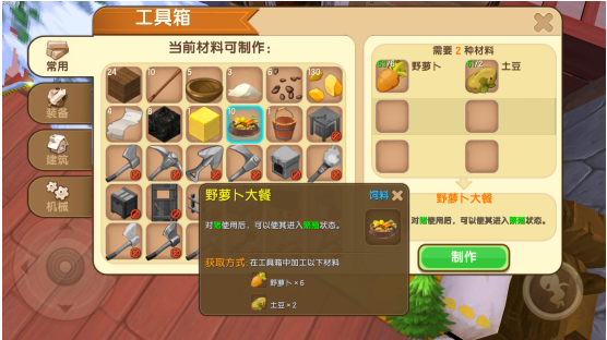当胡萝卜与土豆养殖成功后,利用工具箱就可以合成胡萝卜大餐了,不知道各位玩家学会做胡萝卜大餐了吗,这可是养猪专属食物!