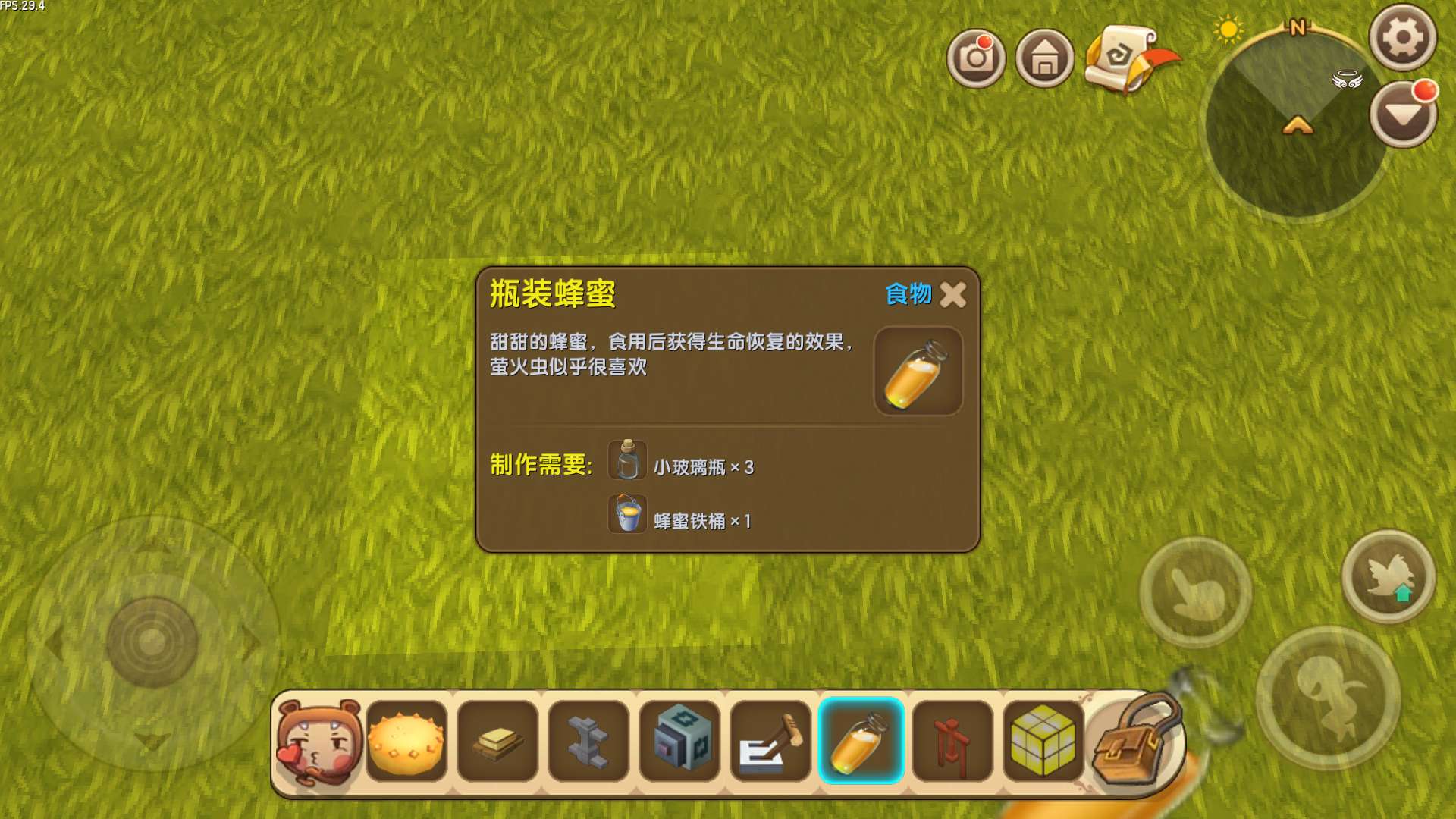 其中瓶装牛奶可以使用玻璃瓶点击喂食了甘蔗的牛群收获到瓶装牛奶,瓶装蜂蜜的合成需要一个小玻璃瓶和一个蜂蜜铁桶。蜂蜜铁桶的制作则需要一个铁桶和三个蜂巢碎片。
