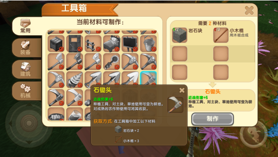 精铁加上木头,最终就可以利用工具箱,合成锄头了。不同矿石做出的锄头功能也不太一样,精铁只能对一格土地起作用,黄金锄头能够对周围八格土地进行处理,虽然有一定的冷却时间,还是极大的减少了玩家的动手时间损耗。