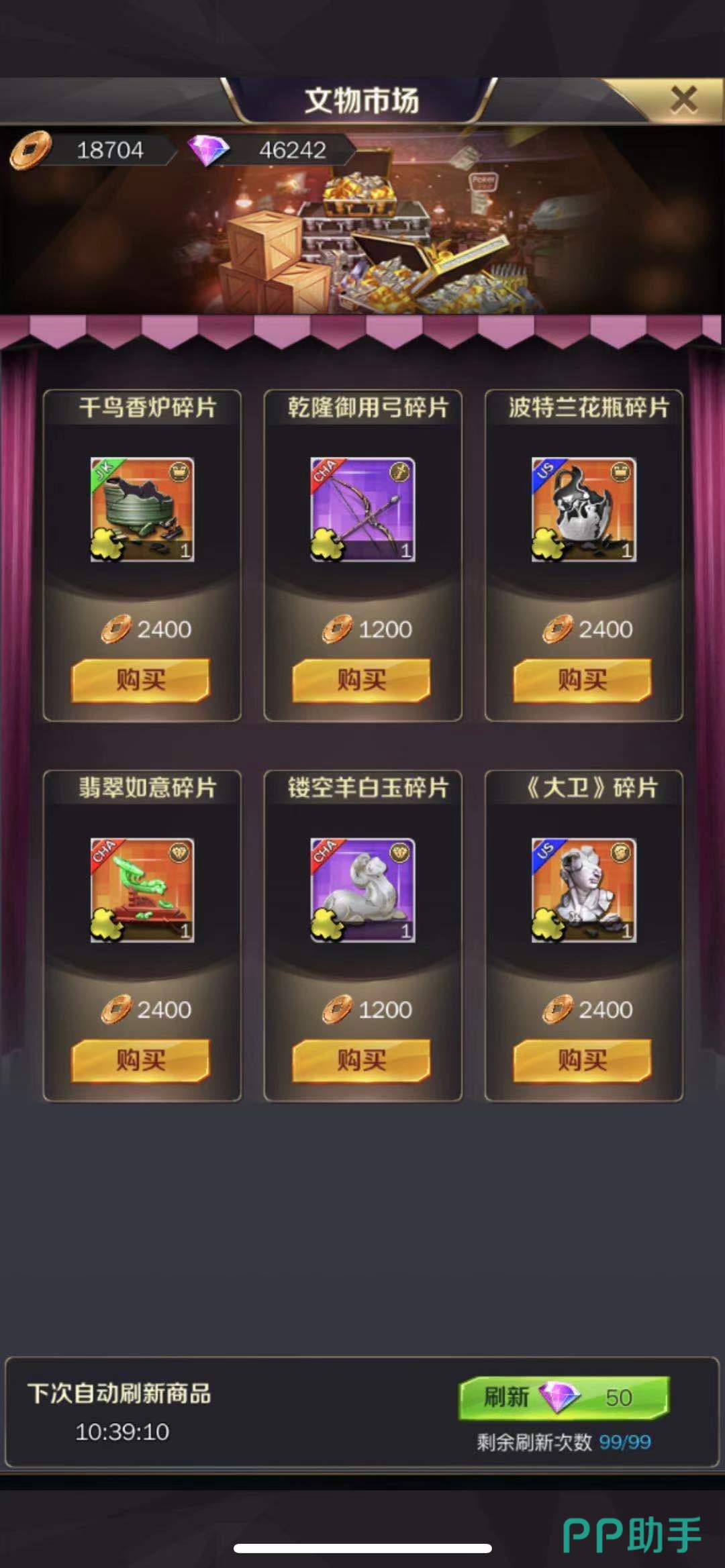 文物市场:用铜钱和钻石即可在文物市场购买文物碎片,小编目前没有在这个市场中发现一次完整的文物,推荐购买橙色的文物碎片,紫色是最低级的。