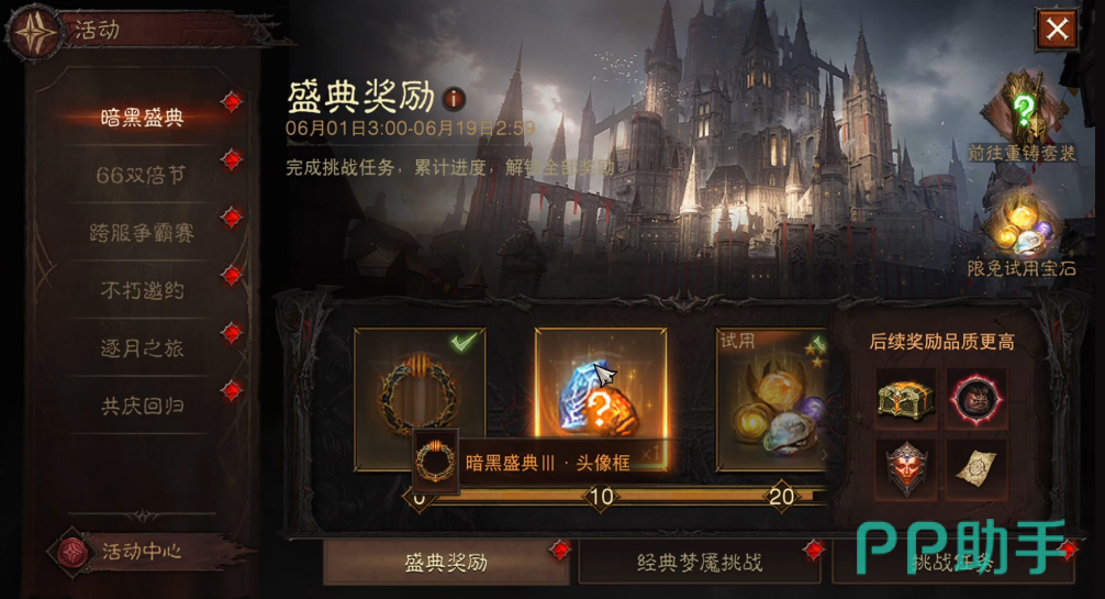 “暗黑盛典”活动的核心玩法之一是每日任务和经典梦魇挑战。在活动期间,玩家通过完成每日解锁的任务,将逐步积累奖励进度。随着进度的推进,玩家将能够解锁包括自选高品质传奇装备、空白契约、强化不朽钥石等多项珍贵奖励。值得注意的是,随着奖励进度的提升,玩家获得的传奇装备将会有更高的词条概率,这为战力提升提供了极大的帮助。