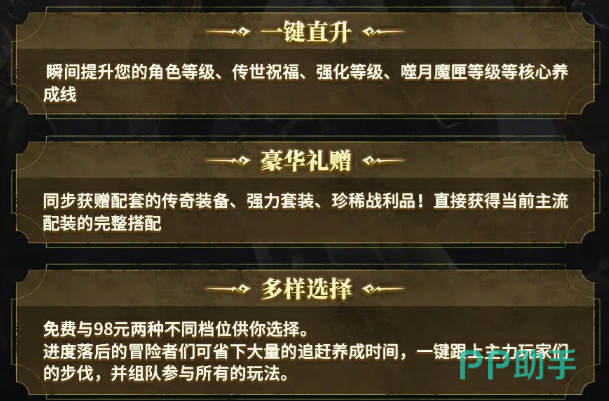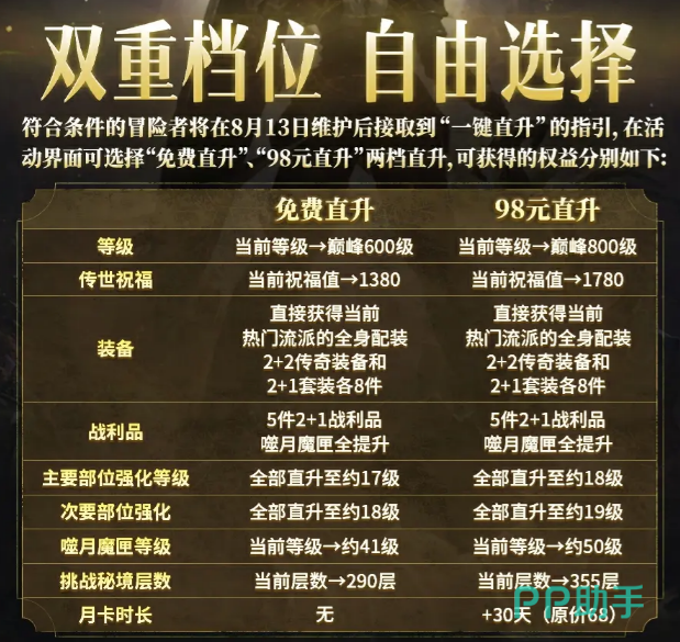 此次活动分为免费档和收费档两个选择。免费档的直升能够将角色提升至600级巅峰,同时提供一系列基础装备和道具。而收费档(98元)则允许角色提升至800级巅峰,此外还会赠送更多的强力装备、套装以及其他珍贵物品,使得玩家在游戏中的起步更加顺利。两者之间的主要区别体现在装备、战利品、以及部分强化等级上。