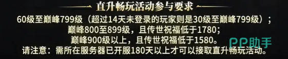 参与直升活动的条件并不复杂。首先,玩家的角色等级需要达到60级,才能够直接参与活动。而对于那些已经有一段时间未登录的玩家,条件则更加宽松,30级以上的角色即可参与。通过活动,玩家的角色可以直接提升至巅峰600级,所有主流装备和配件都会解锁,传世祝福、强化等级等重要养成系统也会同步提升,确保玩家在进入游戏时拥有足够的战力。