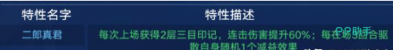 杨戬的能力特性“二郎真君”获取2层印记,而且增添连击的伤害,每3回合遣散本身任意减益特效,增强了技能枪出如龙的伤害,也变相增添了其它技能的力量。
