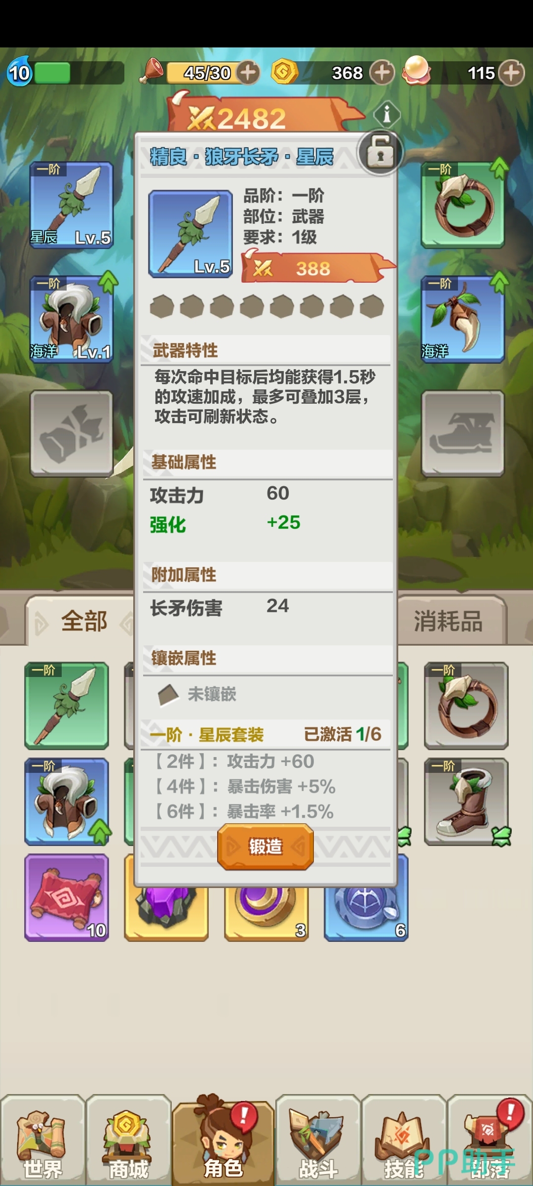 除了关注品质玩家们还要关注武器的羁绊套装!蓝色套装就会触发羁绊,比如:精良的星辰套装在装备2/4/6件的时候会分别触发:攻击力增加60点、暴击伤害+5%、暴击率+1.5%,由此可见羁绊套装的加成也是非常的强大,玩家们一定不要忽略了!