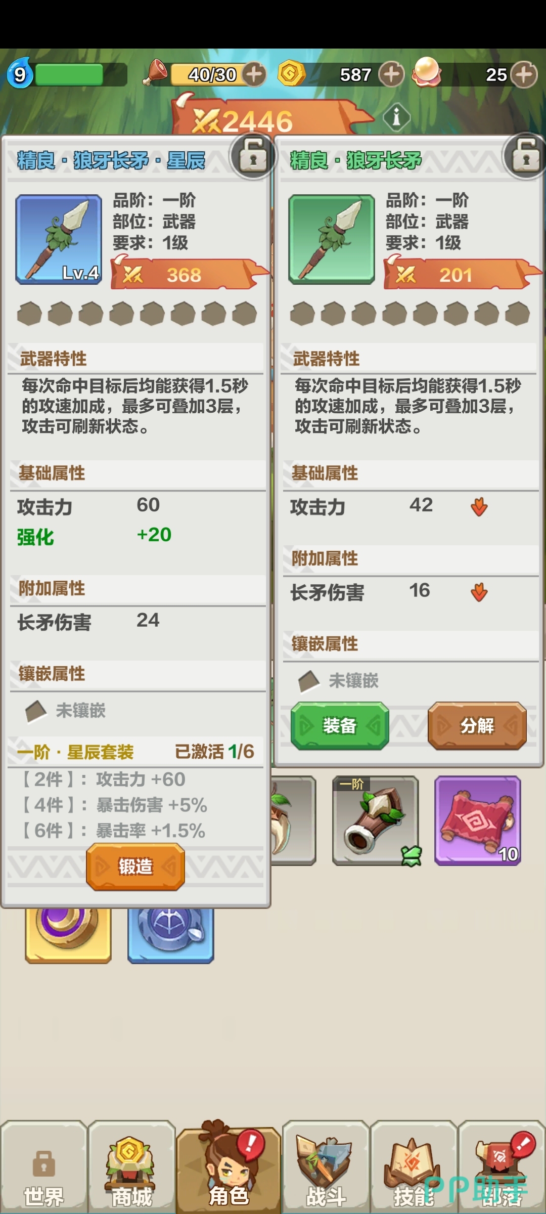 如果是氪金玩家可以直接选择首充赠送的回旋镖和恐狼血性两个装备,时装恐狼血性可以带来150点攻击和600点生命上限,而回旋镖直接带来90点基础攻击和90点附加攻击属性!前期刷图完全不用忧愁!