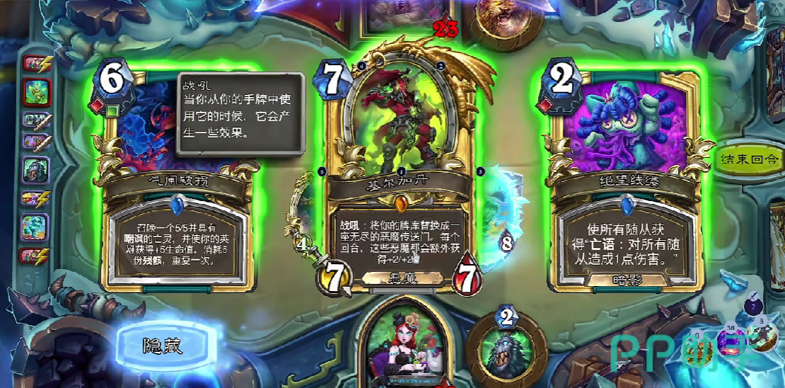 在你的回合开始时,从你的手牌中召唤一个恶魔,注意是回合开始,并不是回合结束的时候召唤恶魔,不会消耗武器耐久,但是比较怕软泥怪,可以让那些有副作用的恶魔直接召唤上场。