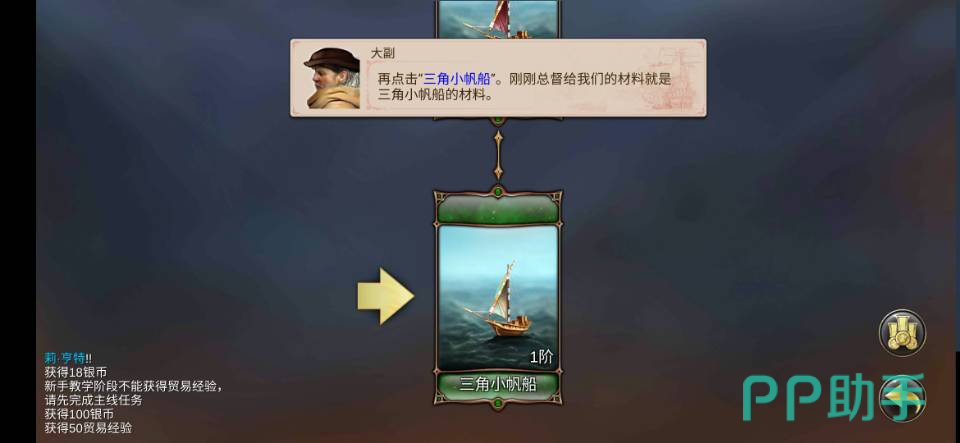 4.然后我们会进行建造海船的任务,这也是我们自己建造的第一艘船,与系统本身给予我们的一样,第一艘船是一阶的三角小帆船。