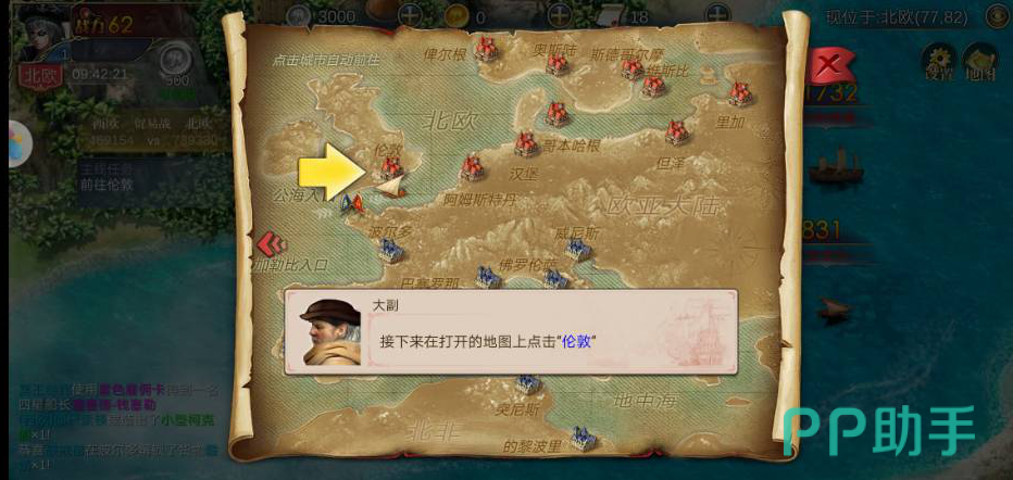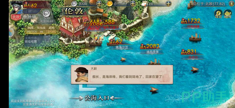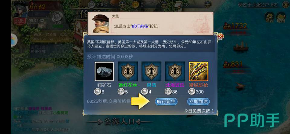 2.在游戏中画面是可以看到海上除我们之外的玩家的,也增加了多人交流的可能,我们会在伦敦海岸线边开启自己的首批毛衣,点击右边上方的大地图驶向海岸线边的贸易港口,点击航行前往。