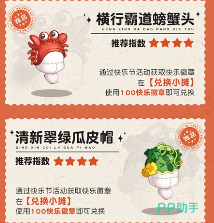 另外在兑换小摊中能使用限定道具兑换的物品还有四款造型独特的饰品,都是戴在头上的,其中三款采用了西瓜,菠萝和苹果的元素,还有是红螃蟹的样式,整体的样式非常有趣,感兴趣的可以尝试入手,毕竟是可以免费获取的。