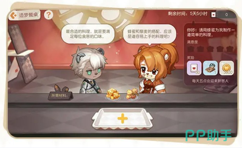 在这里面,大家会遇到一个叫做造梦餐桌的玩法,需要对不同食客的要求进行满足。我们可以在这里面根据他们的要求来制作料理,这里就得看清楚是要什么搭配什么来做了,也比较简单,完成了就能够拿奖励。