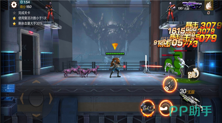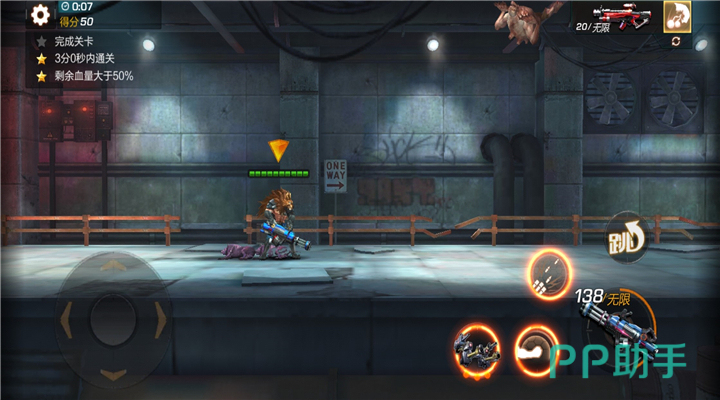 本关是一场突围战,玩家置身于一个狭窄的房间里,房间两侧和空中会出现各类的敌人进行攻击,所以玩家的火力值很大程度上决定了本次挑战的输赢。本关为大家推荐的主武器是L-7镭射步枪,镭射步枪的激光伤害是散射到后方的,几乎对路径上的所有敌人都会造成伤害