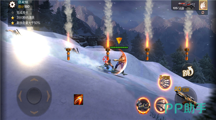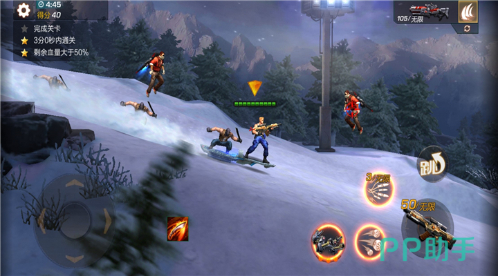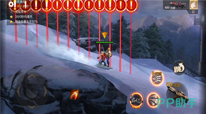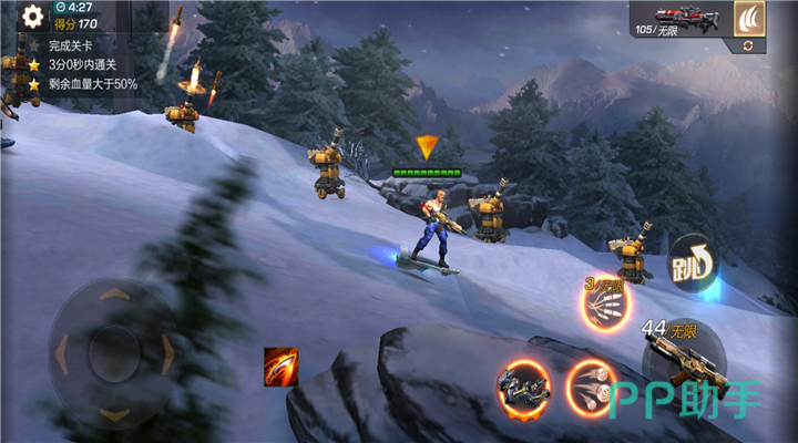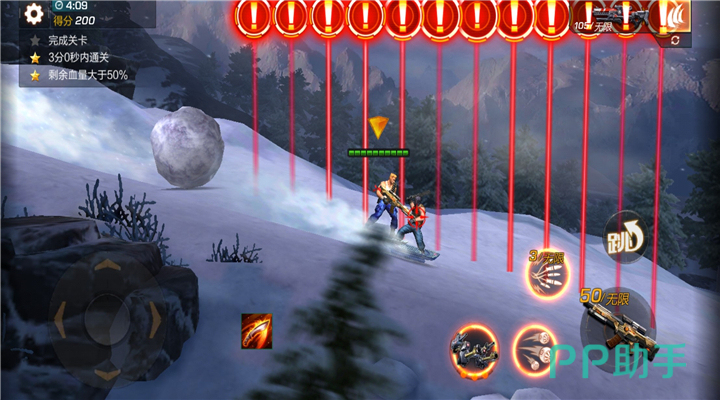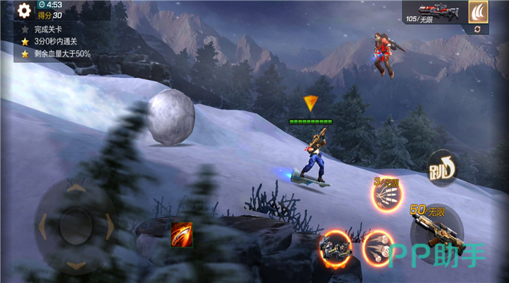 本关卡是一场奔袭战,玩家驾驶滑板从雪山上一跃而下。而玩家在进行战斗时会有大雪球从雪山上翻滚而下,这个大雪球撞击到玩家的伤害是非常高的,玩家如果不小心被撞到想要取得三星就比较困难了。