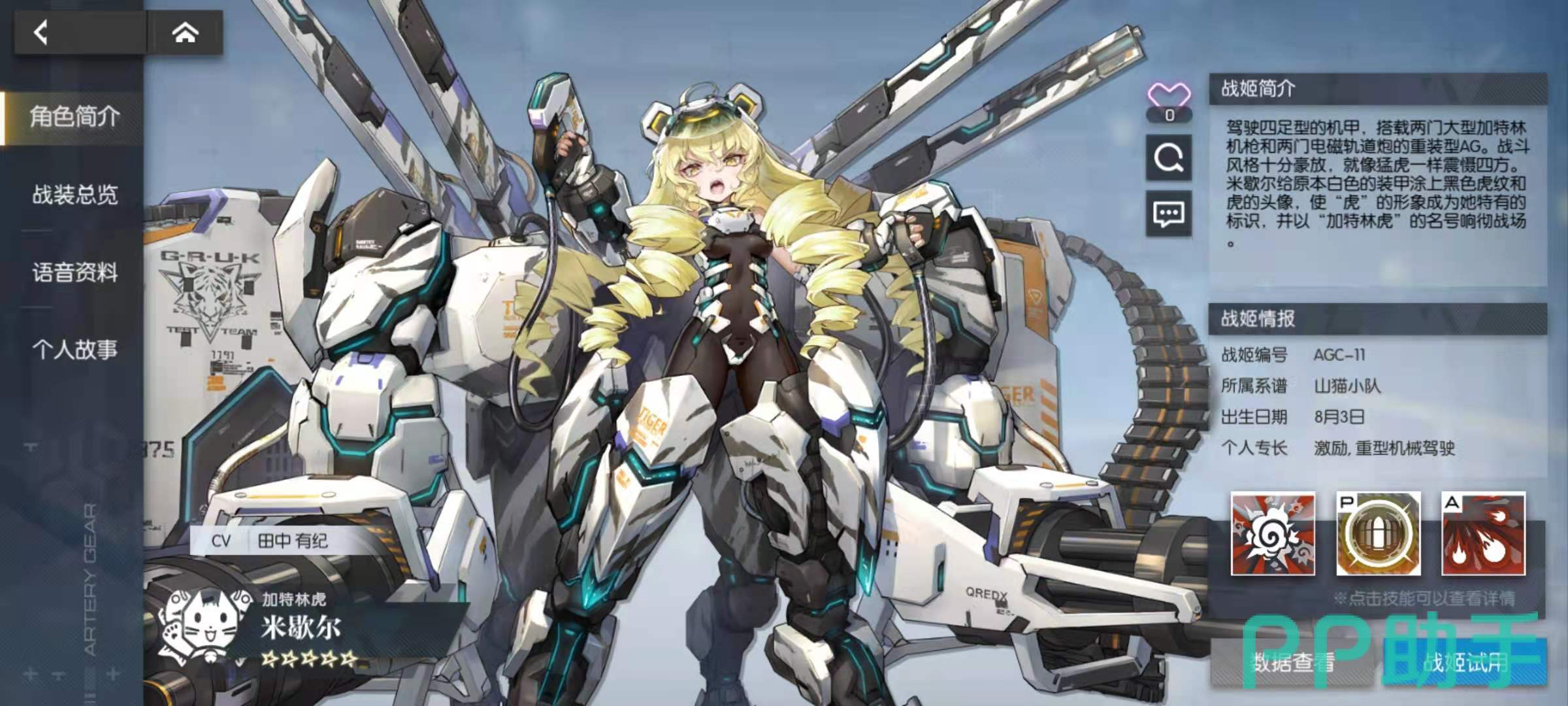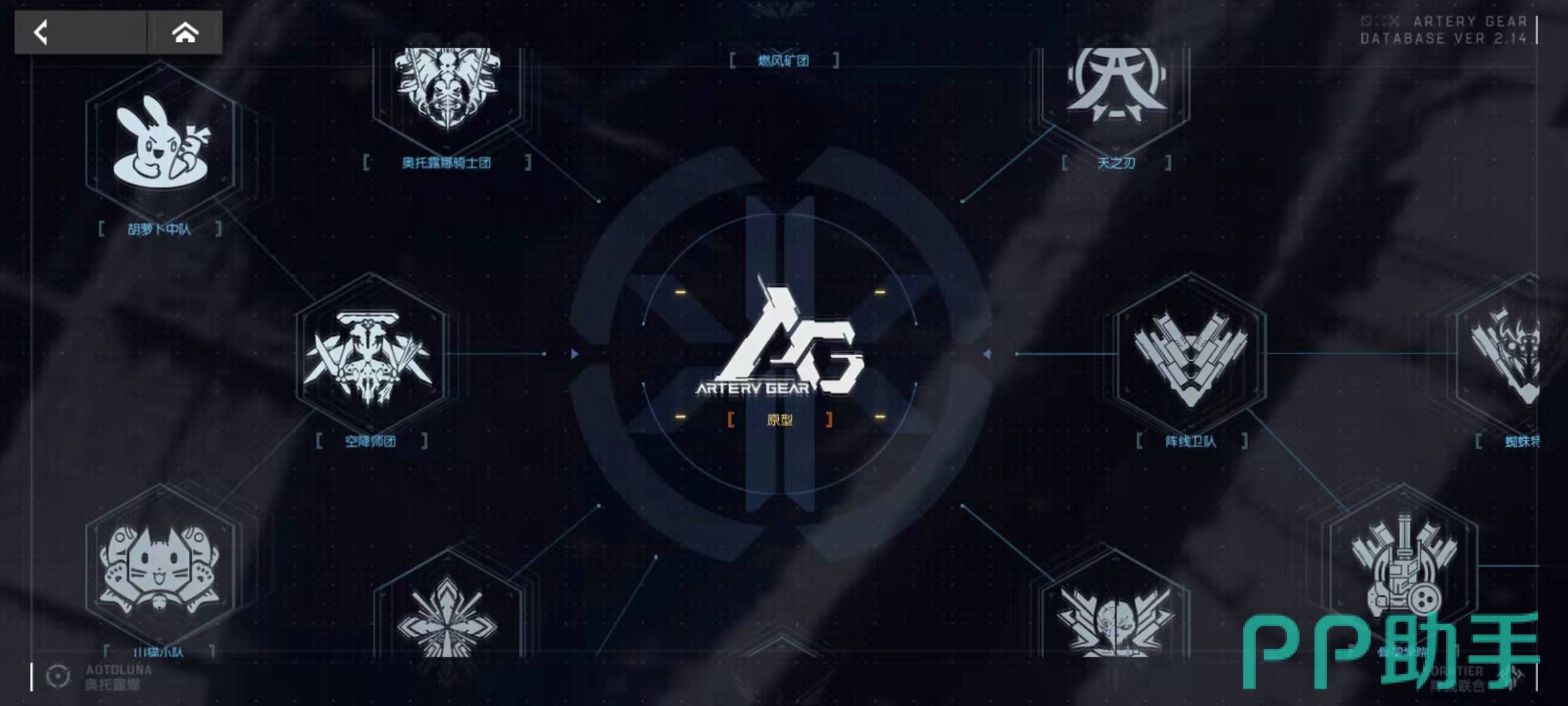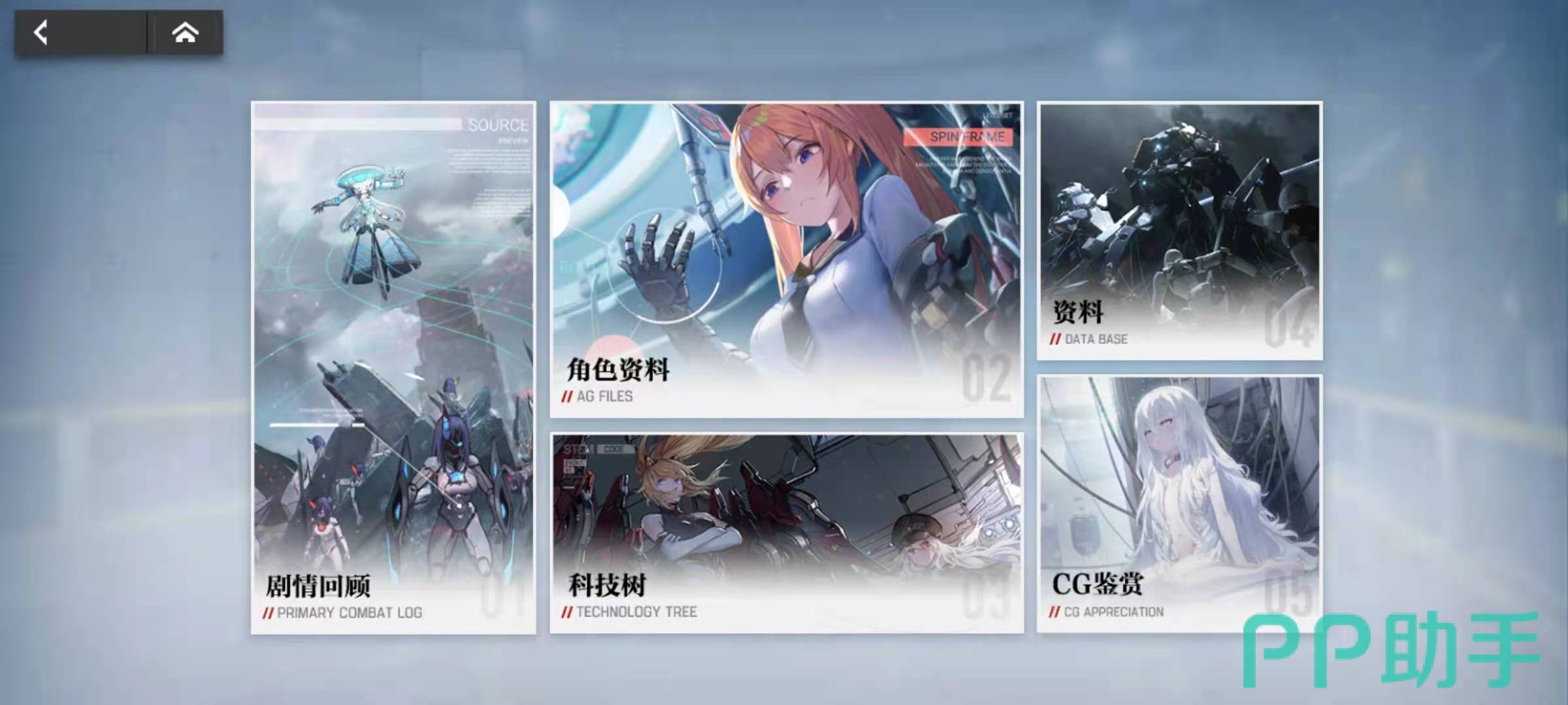 其中剧情回顾主要是玩家已经闯过的关卡进行动画的回放,角色资料中包括当前全部已经可以获得的角色资料,科技树是不同的科技流派对应的资料,CG鉴赏是欣赏游戏CG,游戏资料里面大都是各种AG机甲的文化背景资料。