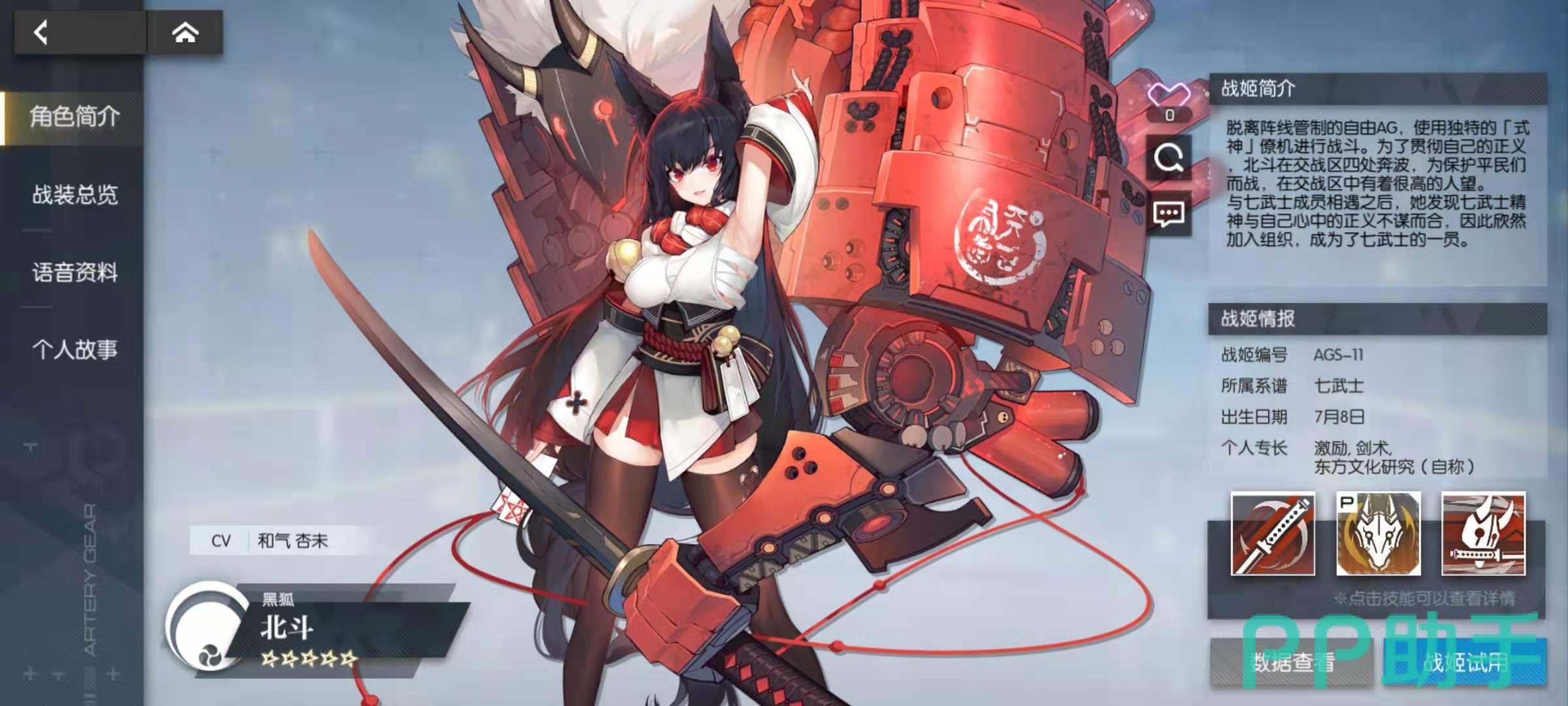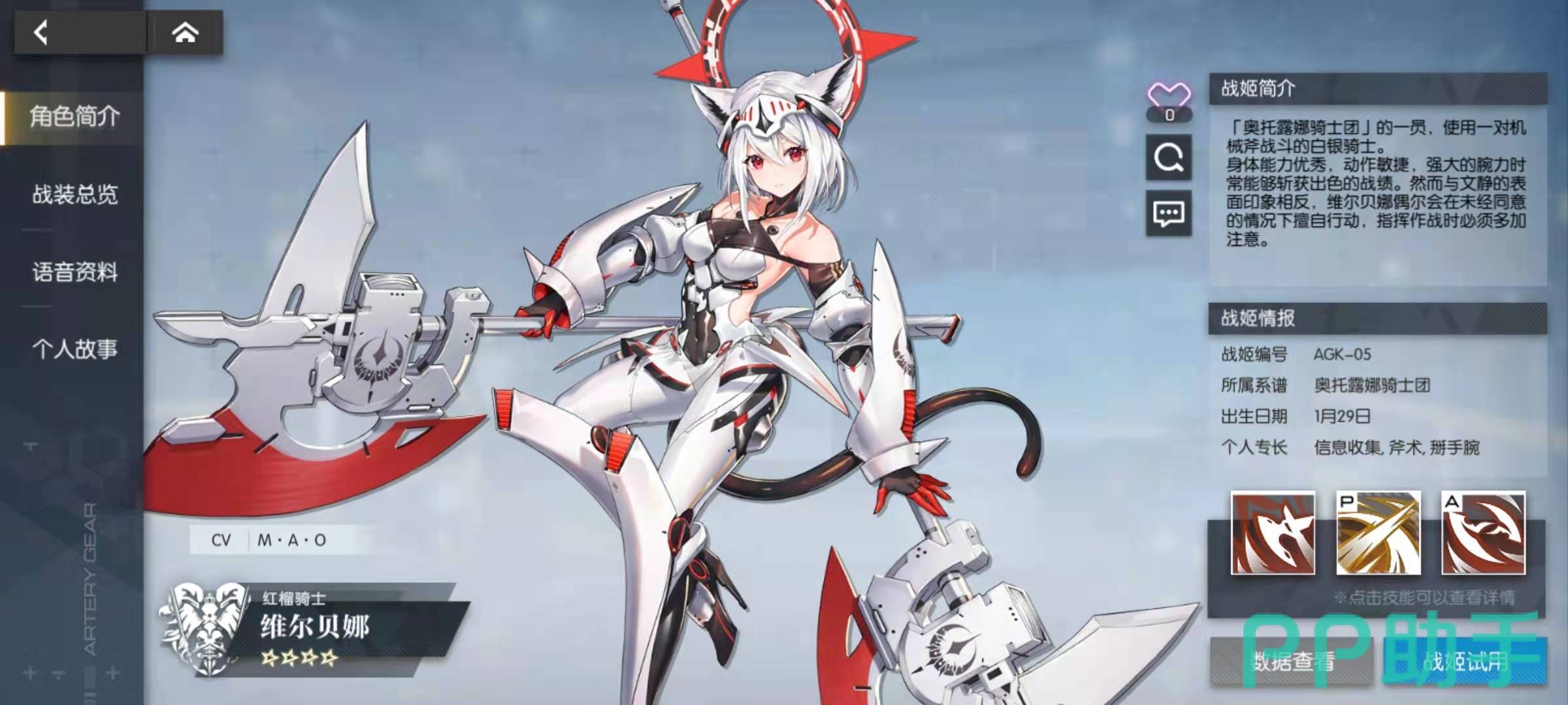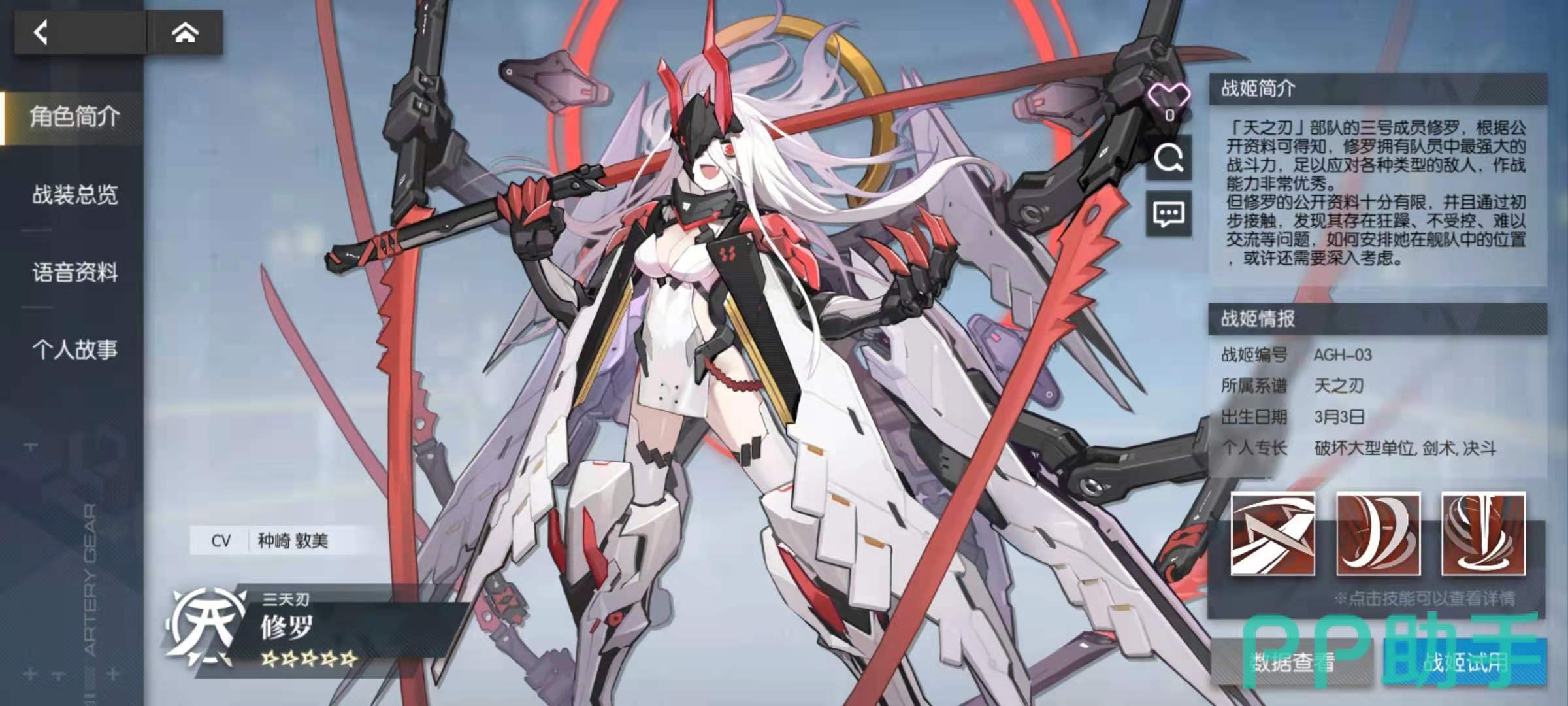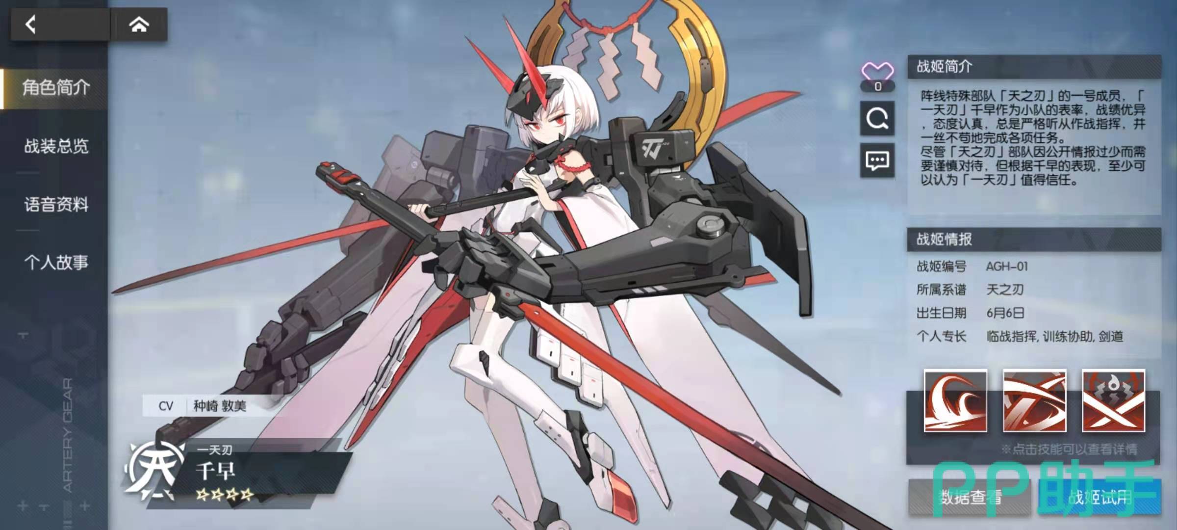 其中剧情回顾主要是玩家已经闯过的关卡进行动画的回放,角色资料中包括当前全部已经可以获得的角色资料,科技树是不同的科技流派对应的资料,CG鉴赏是欣赏游戏CG,游戏资料里面大都是各种AG机甲的文化背景资料。