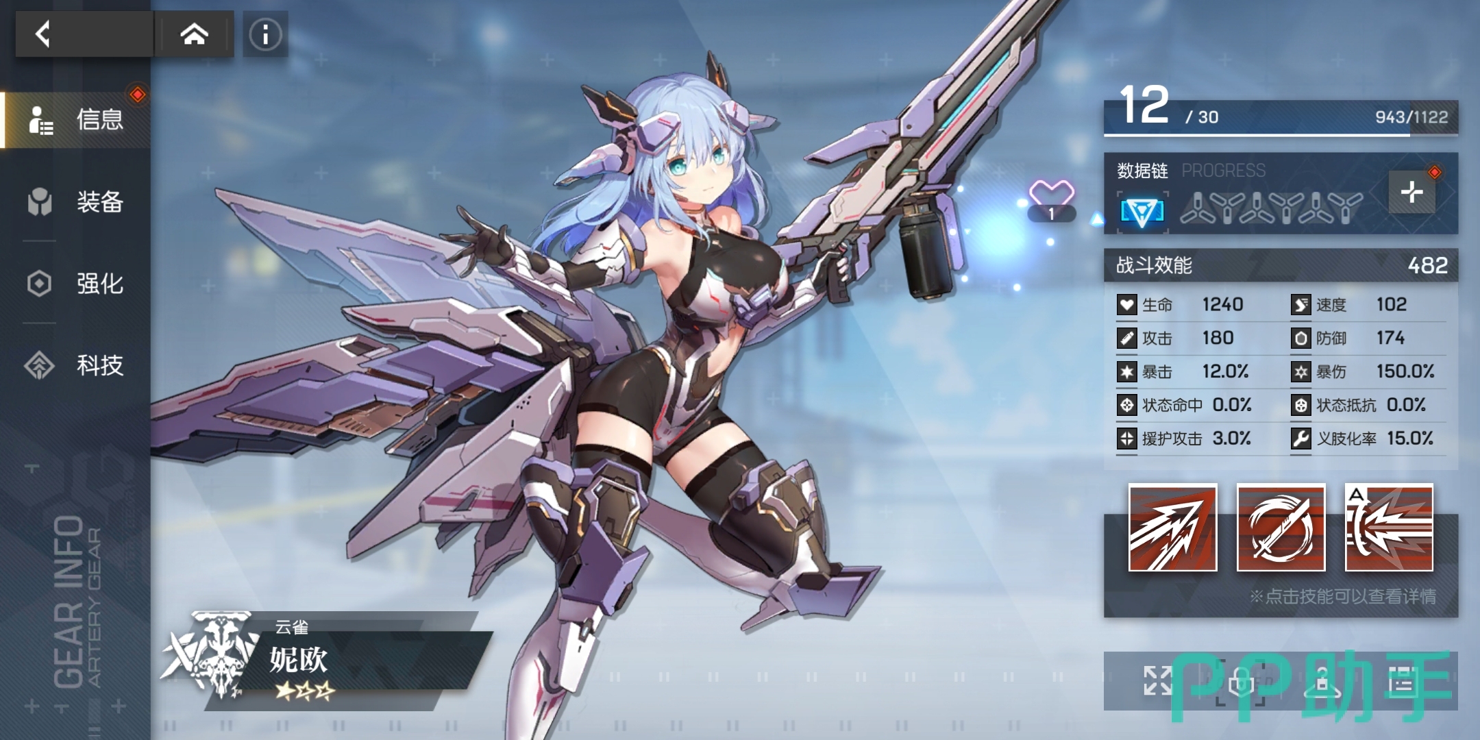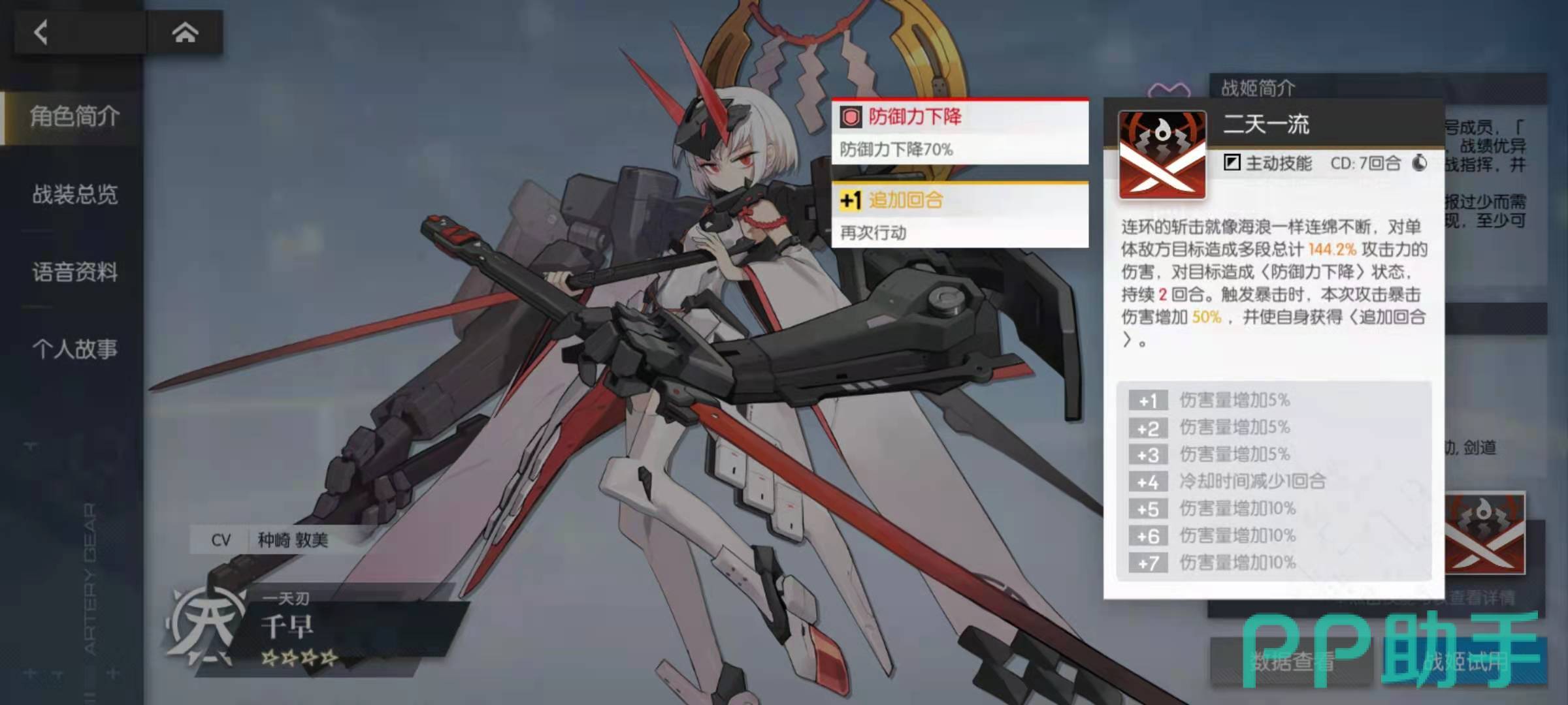 千早的特点是对暴击的需求比较大,同时暴击的收益也高,技能袈裟斩的效果是可以伤害单体机甲,如果本次伤害触发而来暴击,则额外附加20%的伤害。技能血振,效果是摧毁伤害目标的防御能力,造成巨额单体伤害, 如果触发来暴击则延长伤害目标受到的减益效果,包括防御降低的状态。大招二天一流,效果是朝着单体机甲打出连续伤害,并且为伤害目标附加防御下降的状态,如果触发了暴击的话,则追加一次回合数。