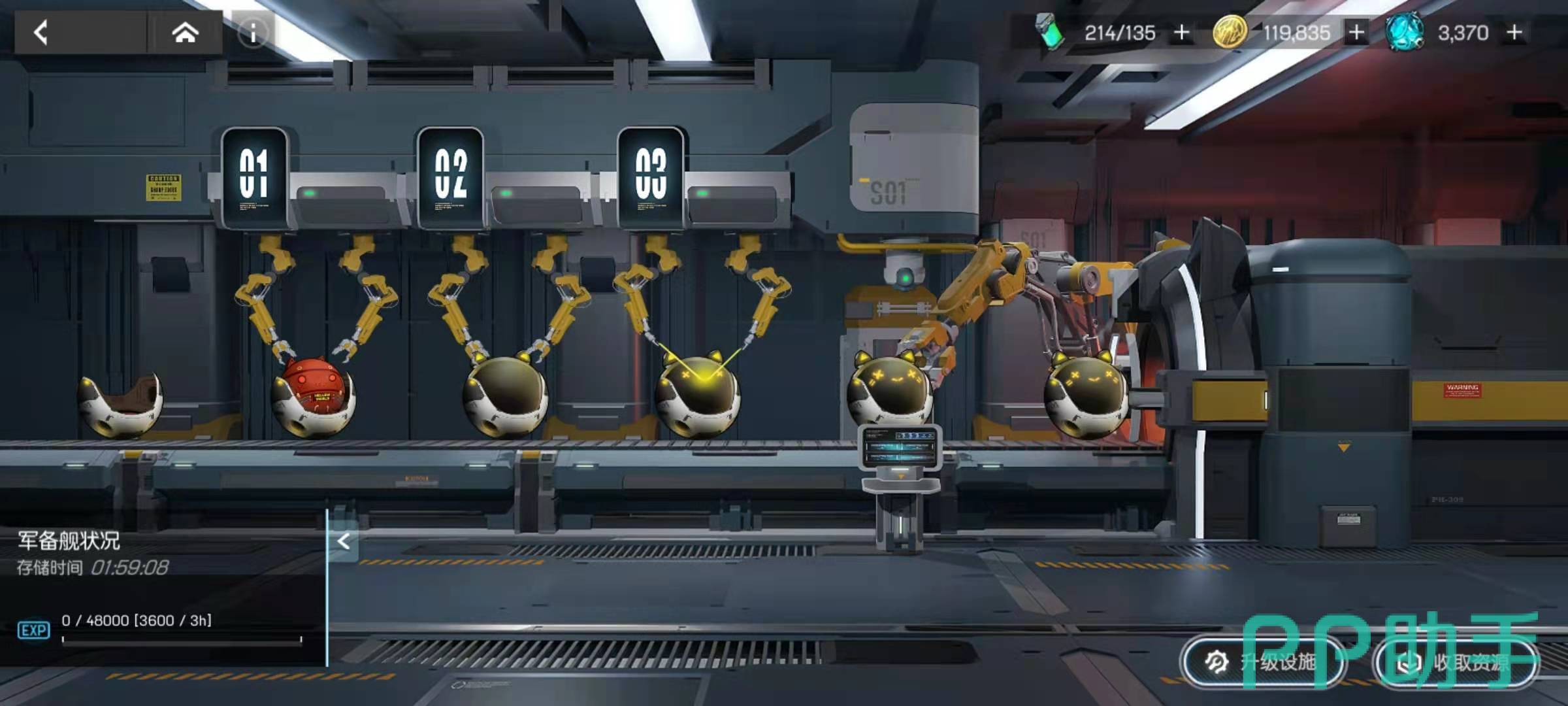 第二个需要氪金的地方是升级舰队的等级,舰队包括军备舰,补给舰,母舰等多只舰艇,每只舰艇都可以获得不同的道具资源。例如军备舰可以获得猫球,用来强化一般的舰船,升级之后可以产生更多的猫球供玩家使用,直接提升了强化能力。补给舰可以获得金币,金币是升级很多重要设置的道具,增加了金币就是增加了整体的建设。母舰的作用是提高全体机甲的战斗力,也是最需要提升的一项。