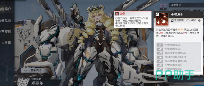 其中米歇尔是号称加特林之虎,三个技能是电磁轨道炮,武装整备和全弹发射,其中电磁轨道炮的效果是米歇尔可以对单体目标造成巨额伤害。并且有一定的几率造成灼烧状态,如果伤害目标已经被灼烧,则伤害提高,这个技能是米歇尔的常规输出技能。武装整备的效果是伤害到被灼烧的目标的时候,可以追加武装整备的效果,可以为全体己方机甲附加攻击力上阵的状态。