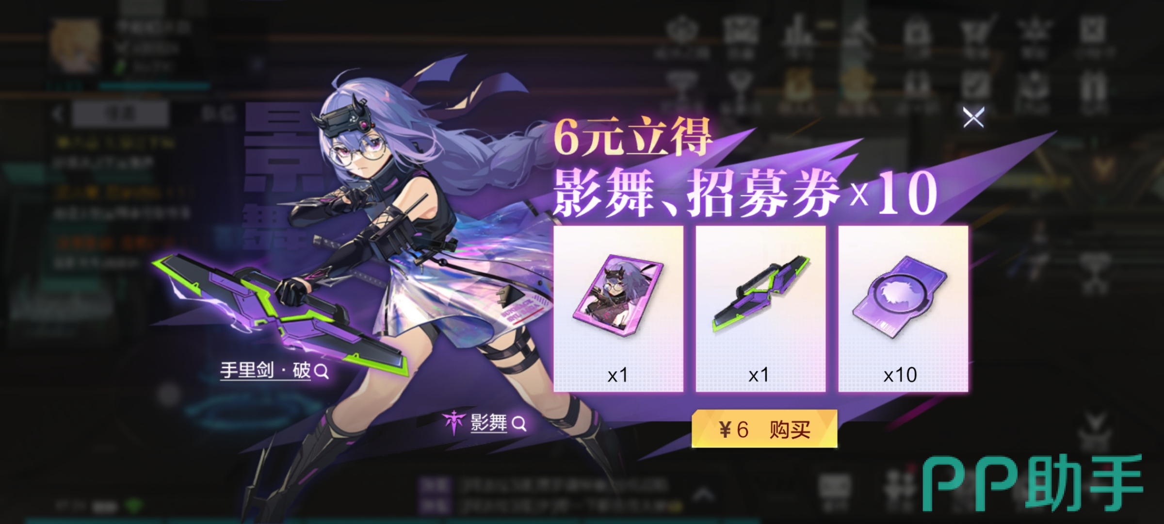 首充礼包:花费6元就能获取一名A级猎人影舞,以及她的专属紫色武器手里剑·破,还有10张角色招募券,是一个相当划算的小礼包。