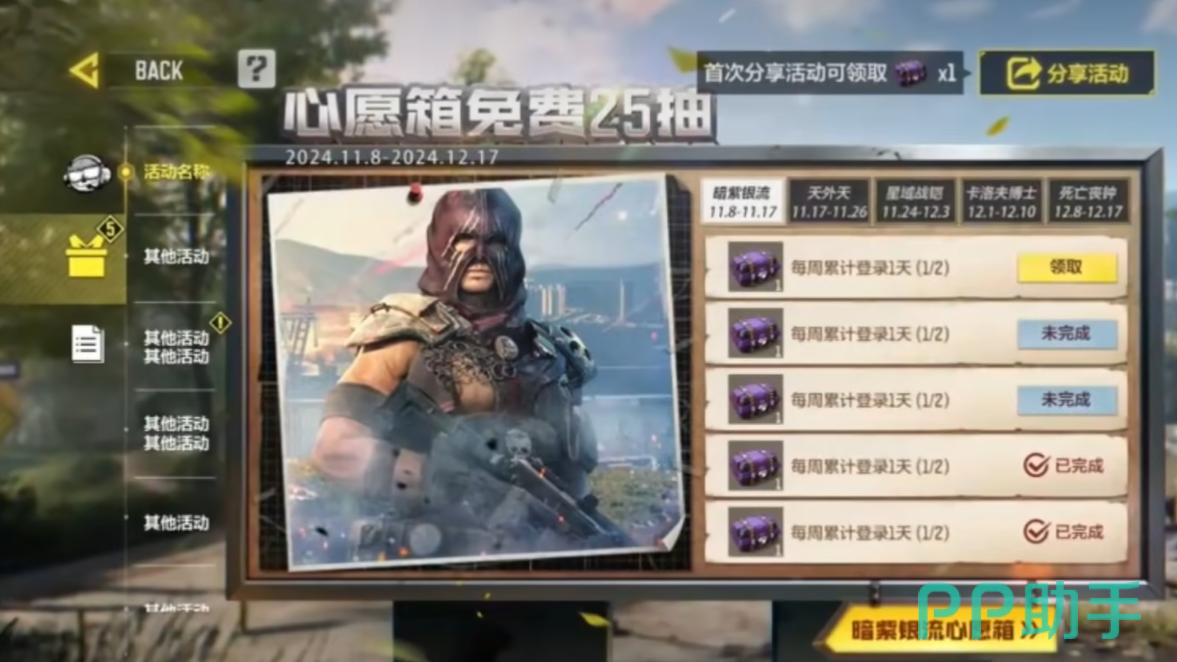 当然,免费25抽心愿宝箱也是一大亮点。从11月8日到12月17日,只需在指定时间累计登录,即可享受这份大礼。宝箱中藏有各种史诗级武器及角色皮肤,让你的装备库瞬间焕然一新。