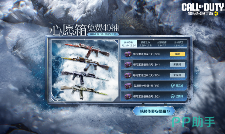 从12月20日开始,全新活动“装扮凛冬树”即将上线!完成每日任务,获取体力点亮属于你的凛冬树,满满的仪式感瞬间拉满!更有史诗级武器PP19-冬境御雪、头像框、背包等诚意奖励静候你的到来。每日收获小成就,每刻都充满大惊喜,战士们可千万别错过这个有趣又有爱的活动。