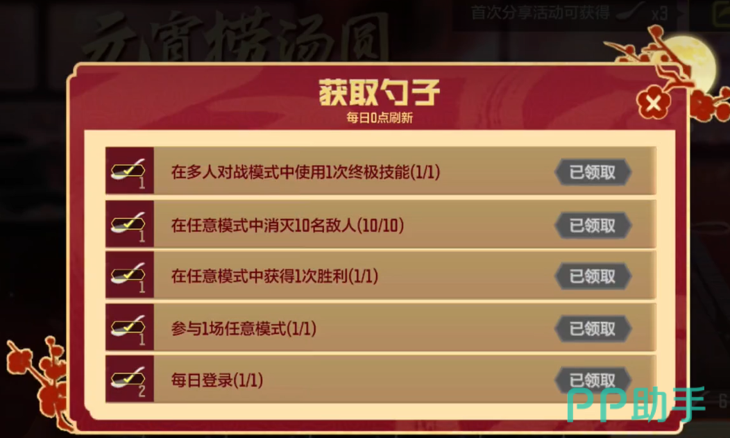 勺子就是你捞汤圆的关键,要获得这个勺子,得完成一些日常任务。具体任务不难,首先是登录游戏,需要玩家们签到。然后是一场对局胜利,这点很简单,打得好就能赢,轻轻松松!接下来是消灭10个敌人。再来是使用一次终极技能,这就得稍微注意下时机。最后是参加任意模式对局,随便选个模式,加入一场就能完成任务。每完成一个任务,就能获得一个捞汤圆的勺子,一天最多可以获得6个。所以,趁着活动时间,抓紧时间完成任务,顺利获得勺子,捞出你心仪的奖励。