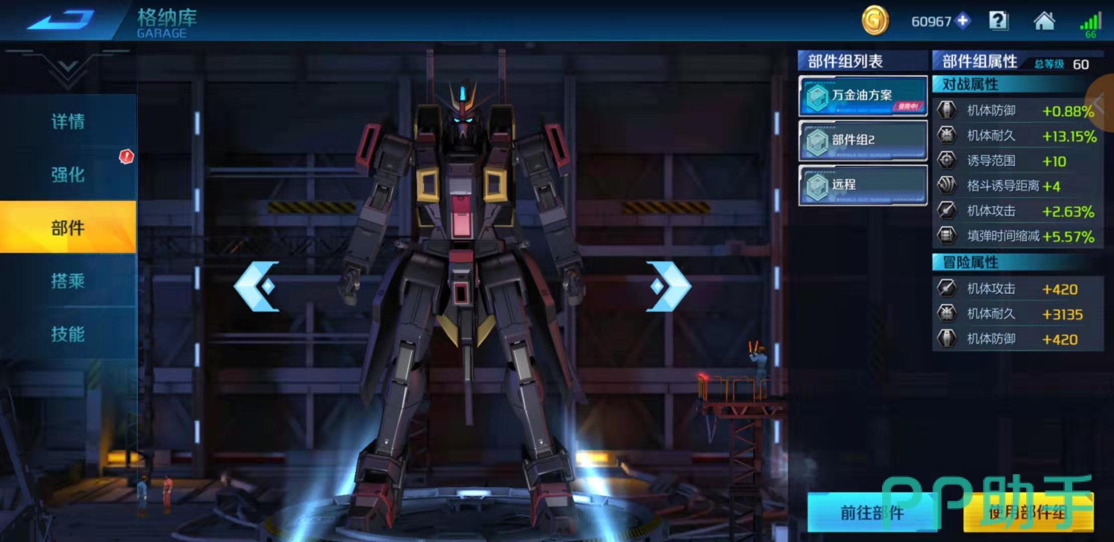 部件主要分为攻击、防御和辅助三大类,每类部件对机体属性的加成方向不同,需根据机体特性与战斗定位进行针对性装配。攻击部件侧重提升格斗诱导、射击伤害等输出属性;防御部件强化耐久、抗性等生存能力;辅助部件则优化喷射槽、冷却缩减等机动性与技能循环效率。部件槽位随机体等级解锁,需优先确保核心属性的强化。