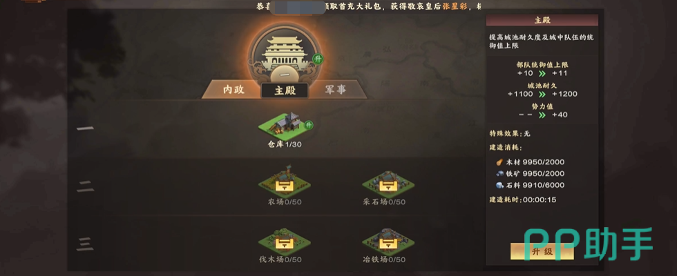 城池建设的话分为内政,主殿和军事三方面的建设,这些建设会消耗大量木材,铁矿的资源,不过建筑修建起来后也能对玩家的实力进行反哺。