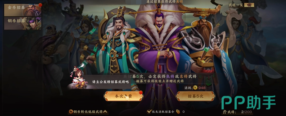 下面再给大家介绍下这款游戏的玩法内容吧。游戏本身有外出征战和建设城池两种玩法,其中前者需要招募强力的武将才能进行,游戏招募武将有单抽和五连抽两种形式,抽五次即可保底获得良将或名将,相对其他游戏的抽卡,还算是比较良心的。