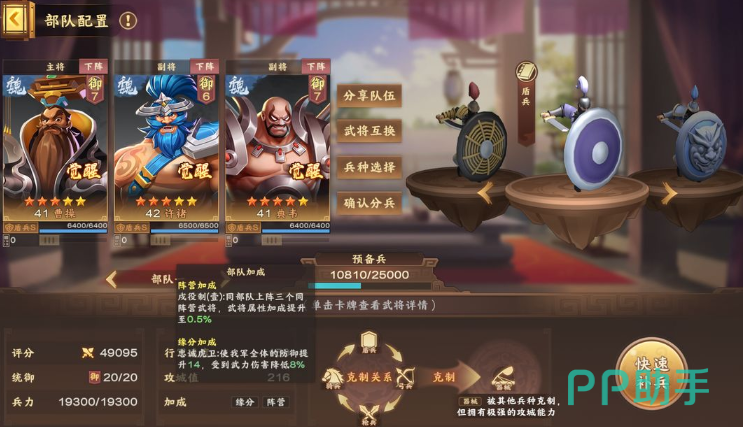 还有一个就是统御值了,这个和武将品质也有关系的。武将越厉害,统御值也会比较高。每个队伍的统御值也有上限的。因此在前期的时候,大家可以选择登记比较低紫色或者橙色的武将,如此一来的话,三个人队伍也可以没负担的进行开荒。玩家如果想要快速优化武将战力,主殿以及中军帐的等级提升也比较重要。