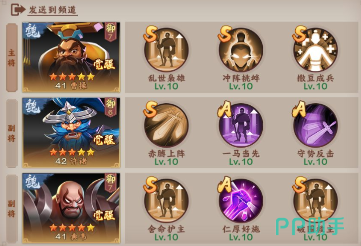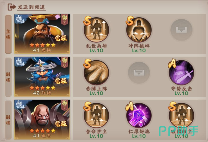 曹操在其中主要是一个带兵的将领,它可以一边指挥骑兵一边在其中发出撒豆成兵的技能,搭配典韦的舍命救主以及许诸的守势反击,这个阵容就稳了。